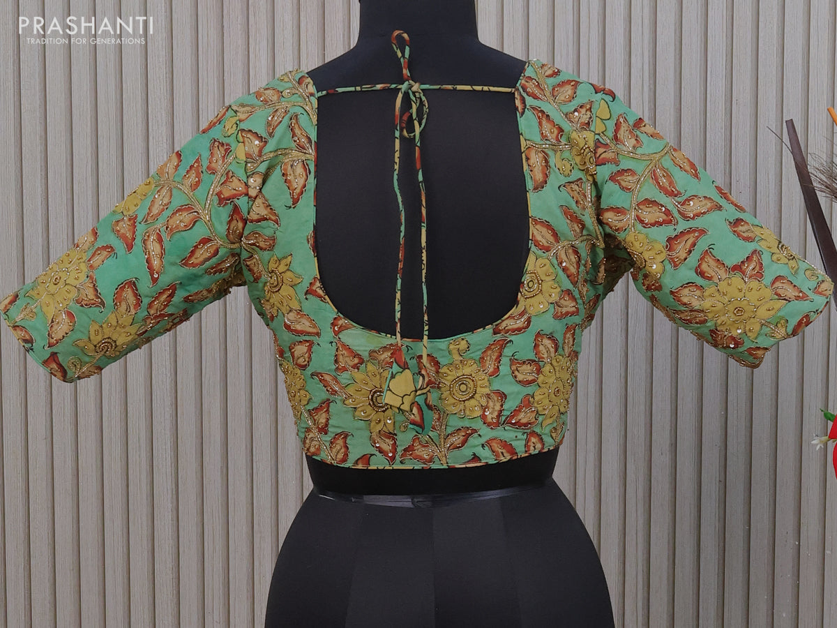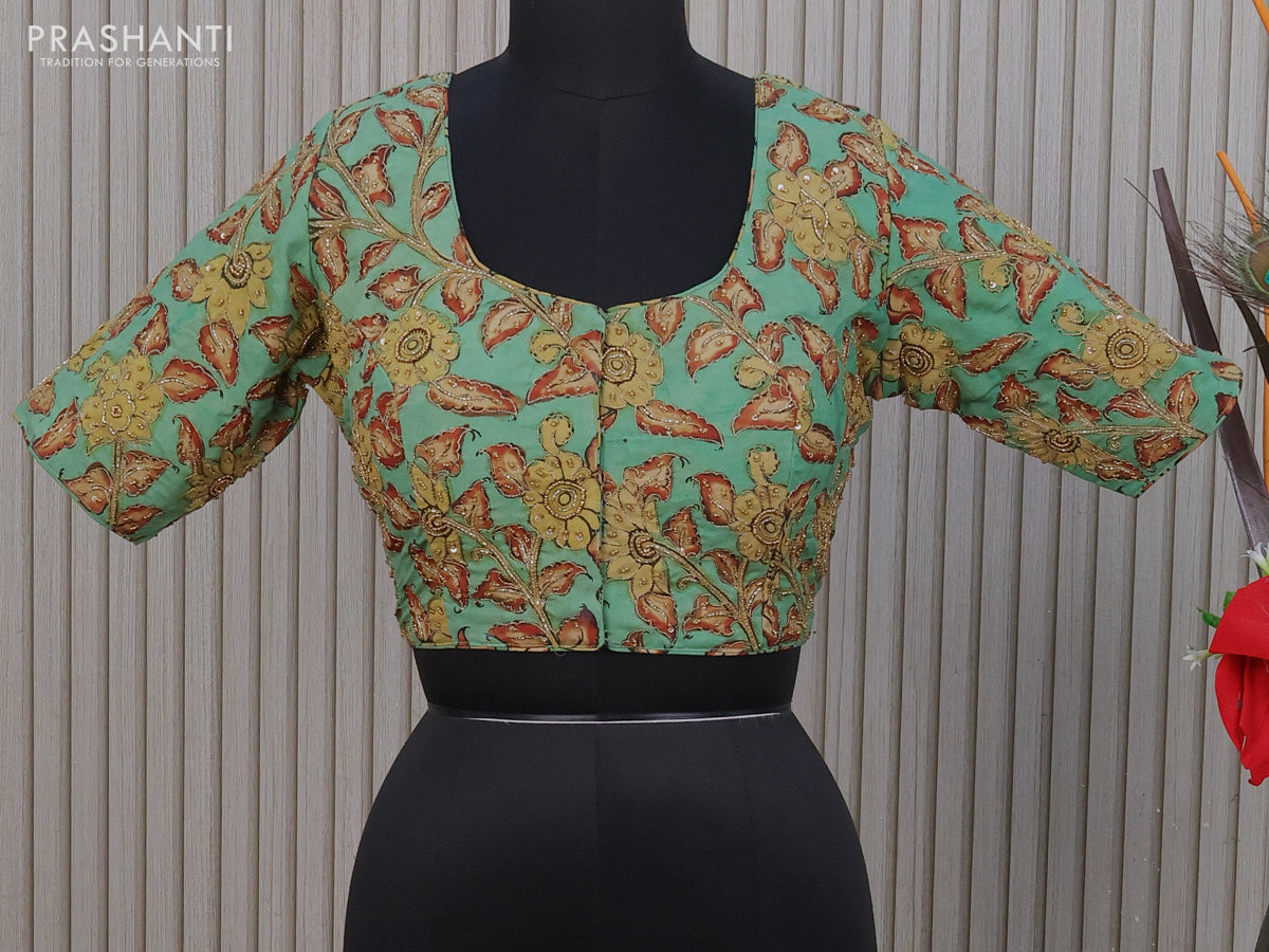 Silk pen kalamkari readymade blouse teal green shade with allover kalamkari prints & pita work and back knot