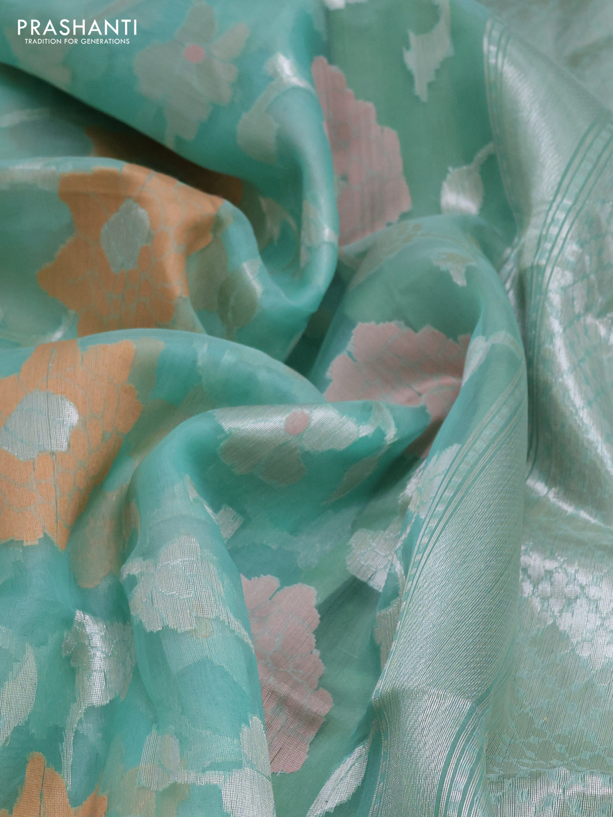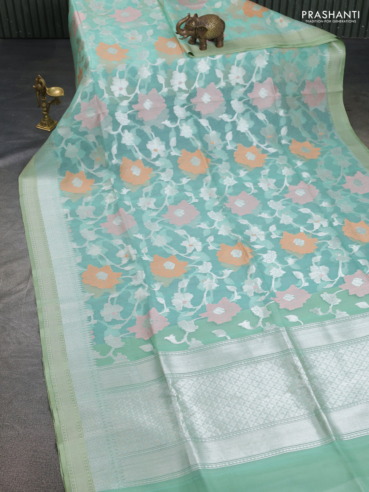 teal green shade and pastel green Banarasi kora jamdhani silk saree
