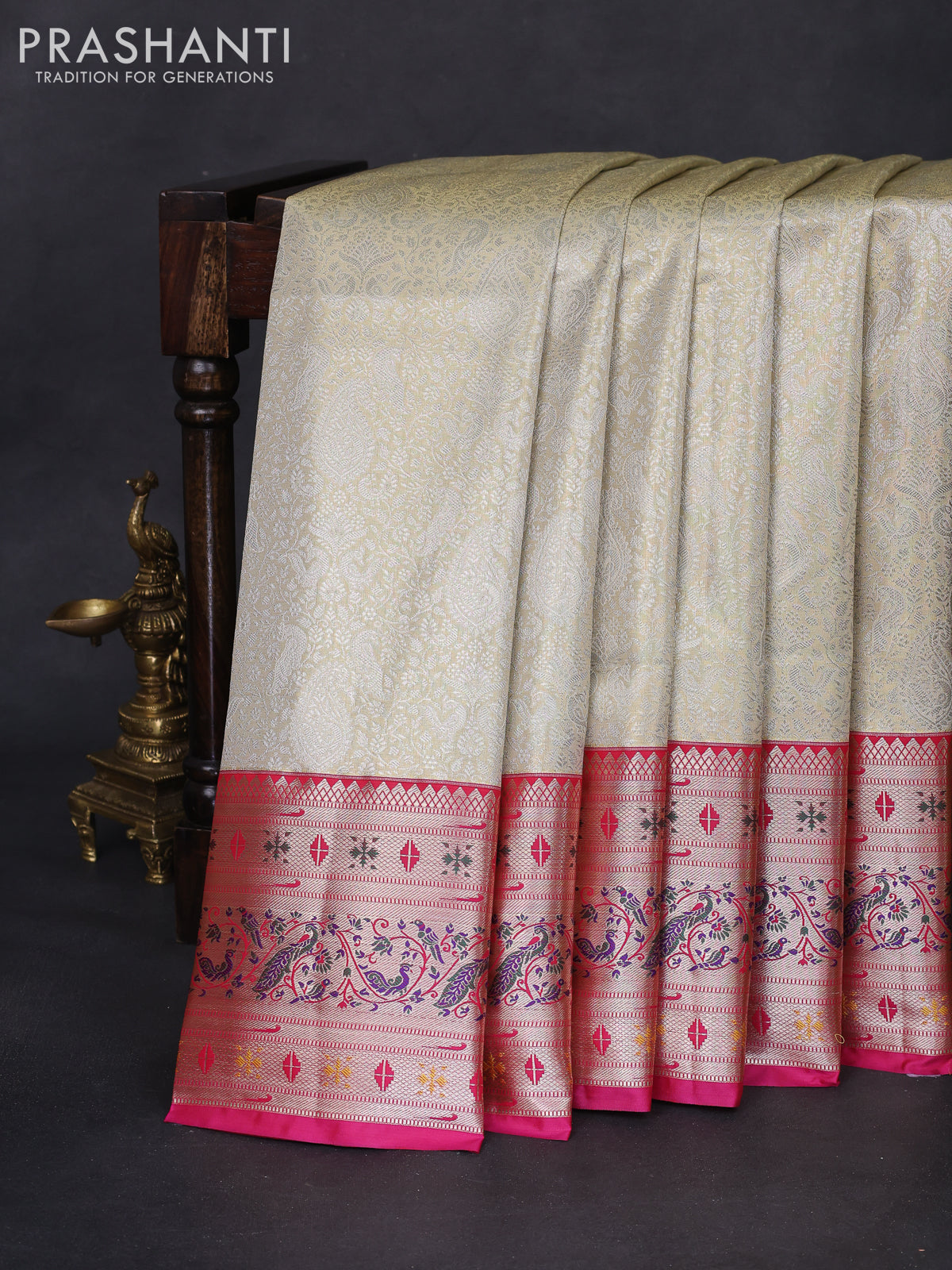 Tissue paithani silk saree cream and pink with allover silver zari woven brocade weaves and zari woven paithani style border