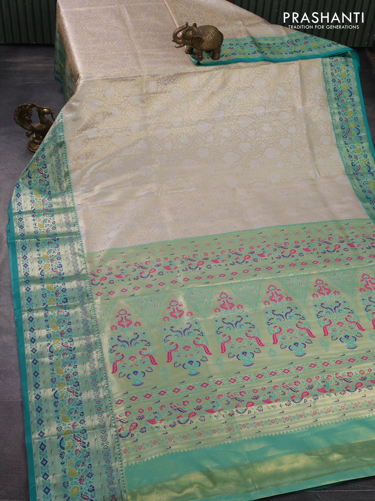 Tissue paithani silk saree sandal and teal green with allover zari woven brocade weaves and zari woven paithani style border