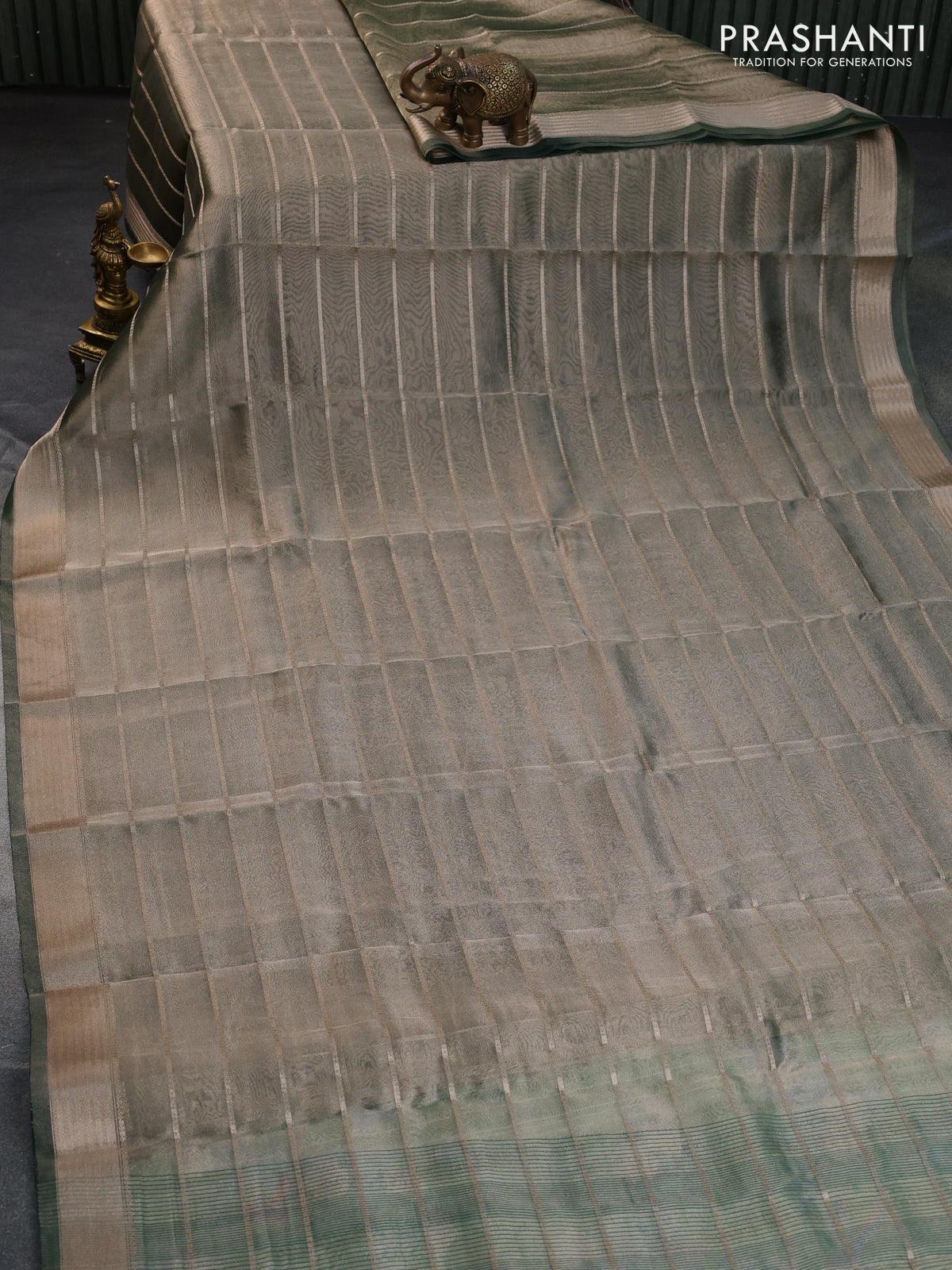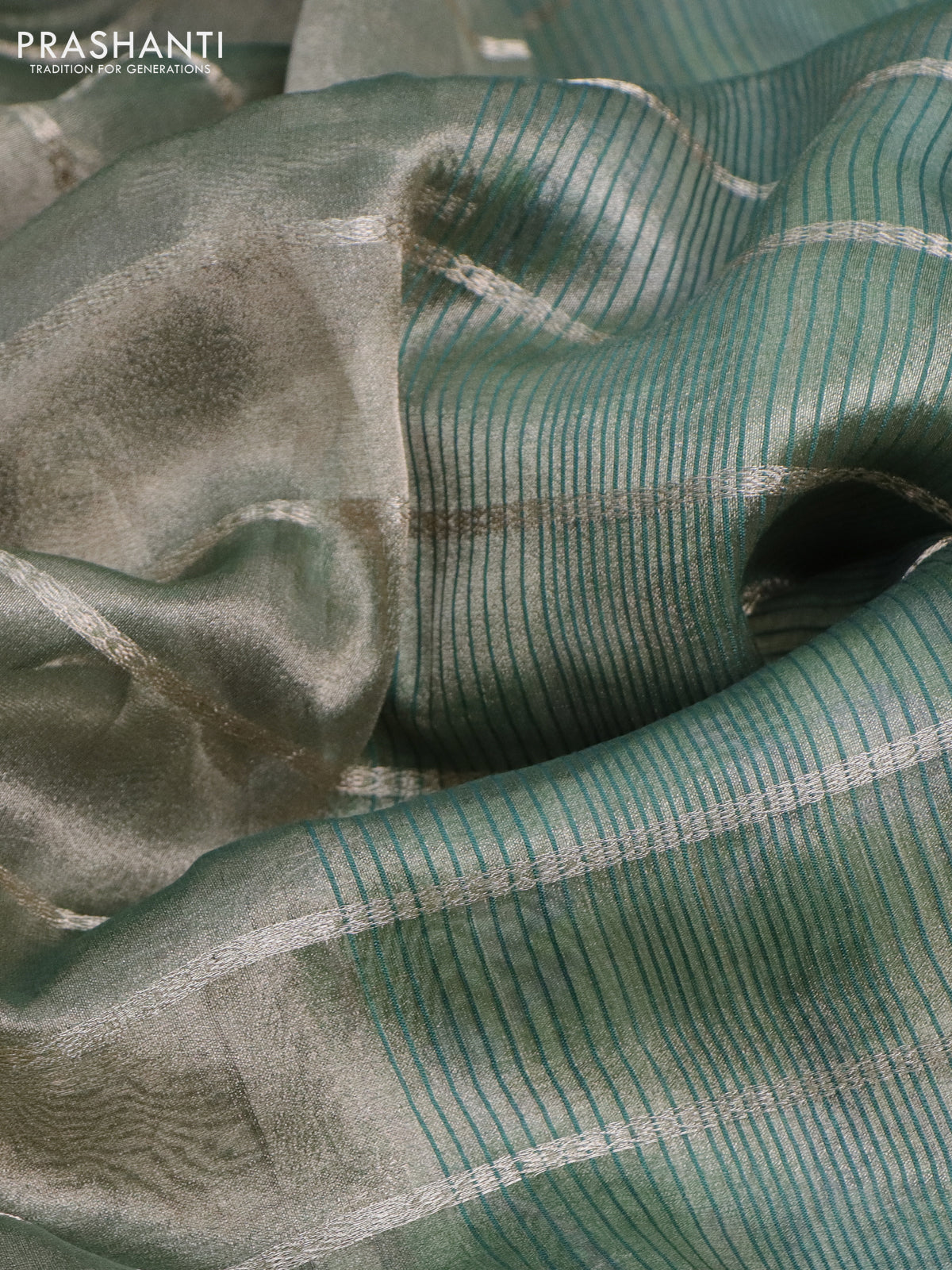 Tissue saree dual shade of green and green with allover zari woven stripes pattern and zari woven border - printed blouse