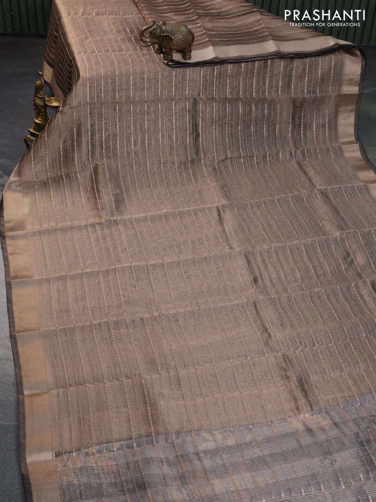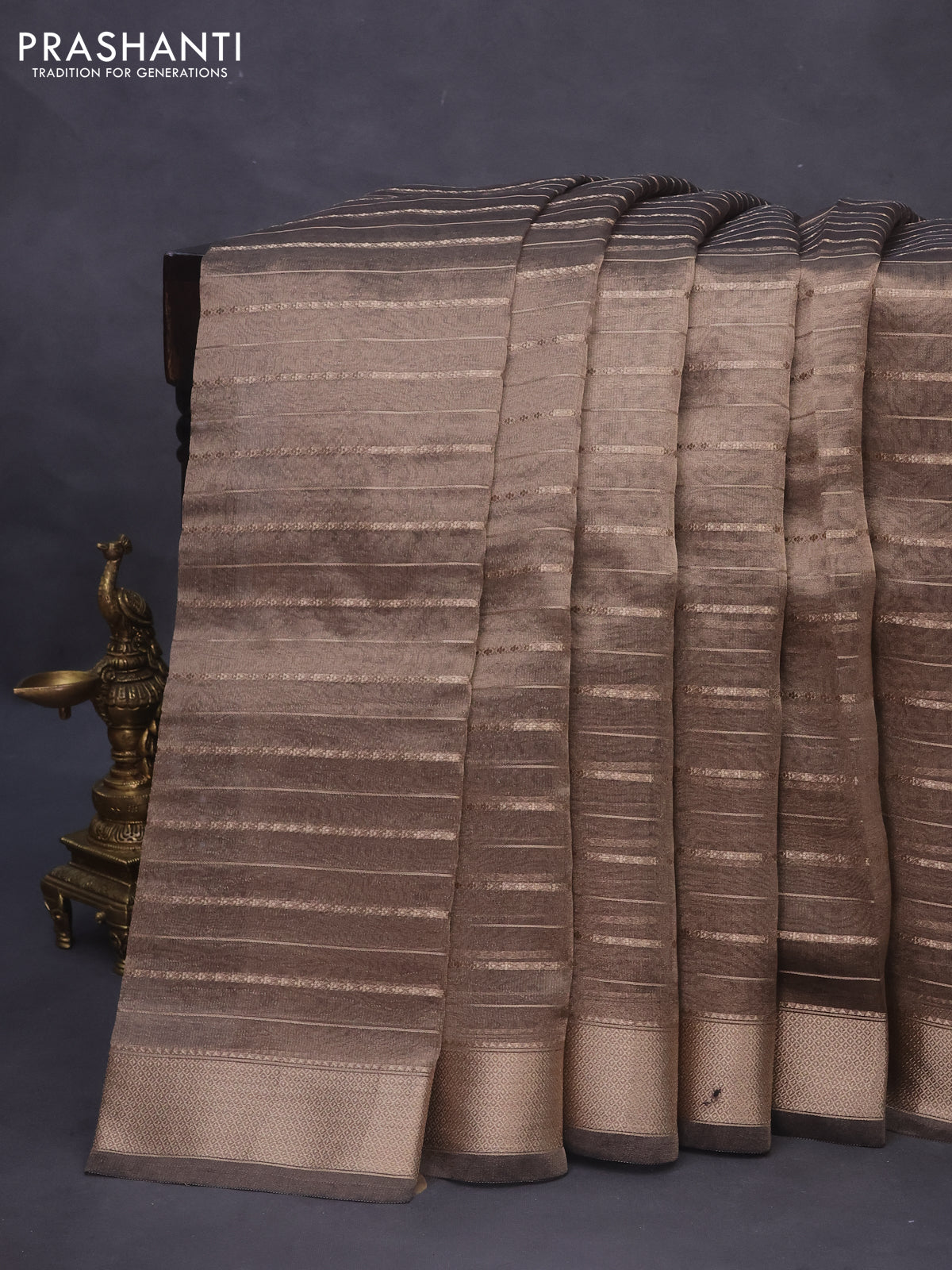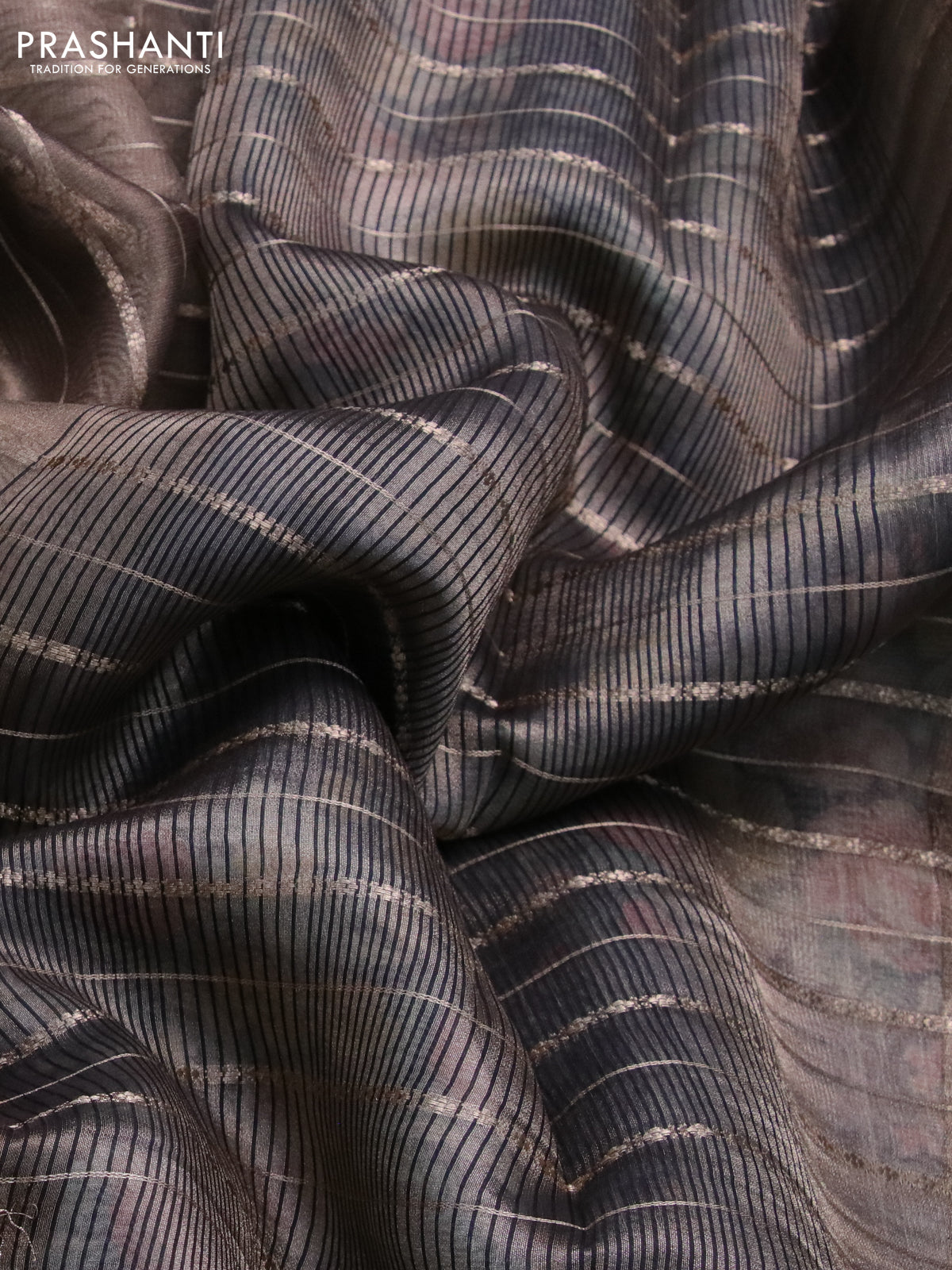 Tissue saree grey shade and black with allover zari woven stripes pattern and zari woven border - printed blouse