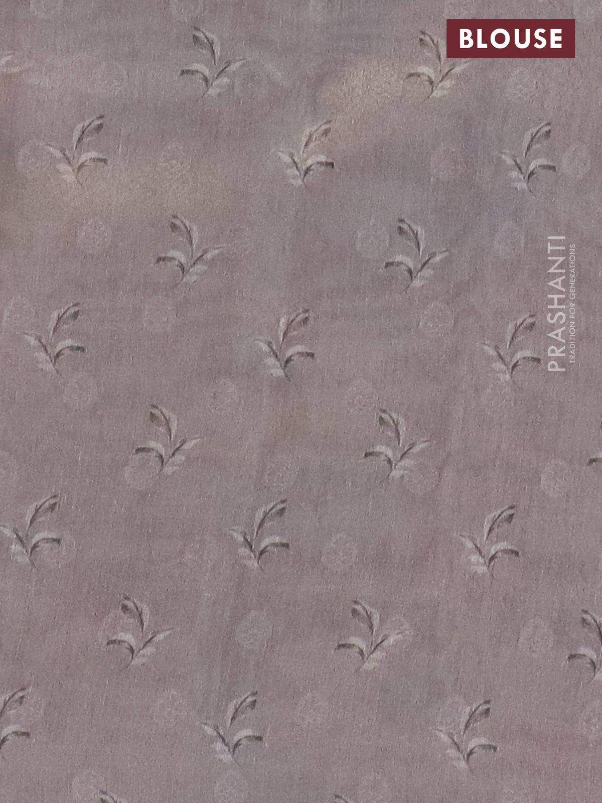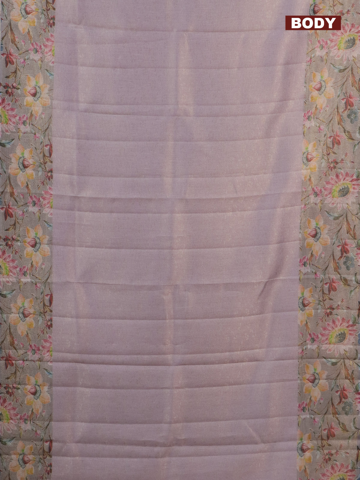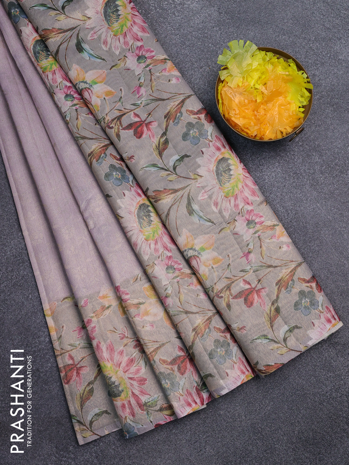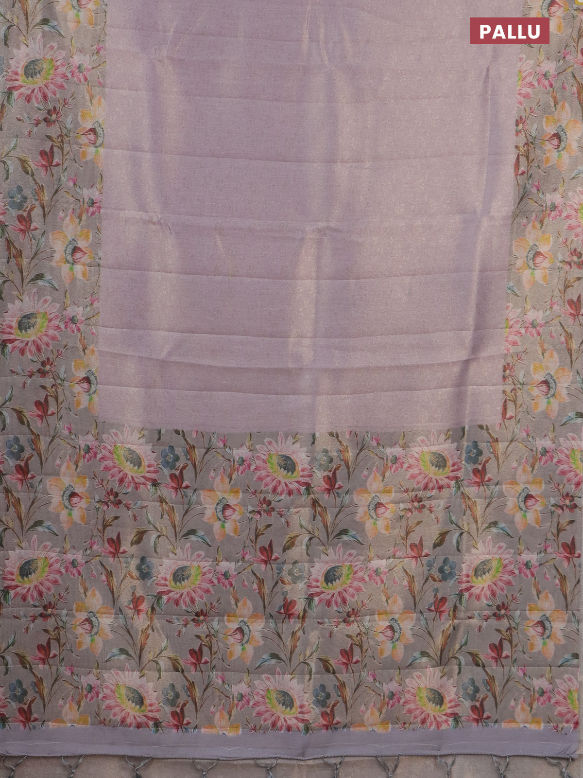 Tissue saree mild lavender and grey with allover zari weaves and floral digital printed border