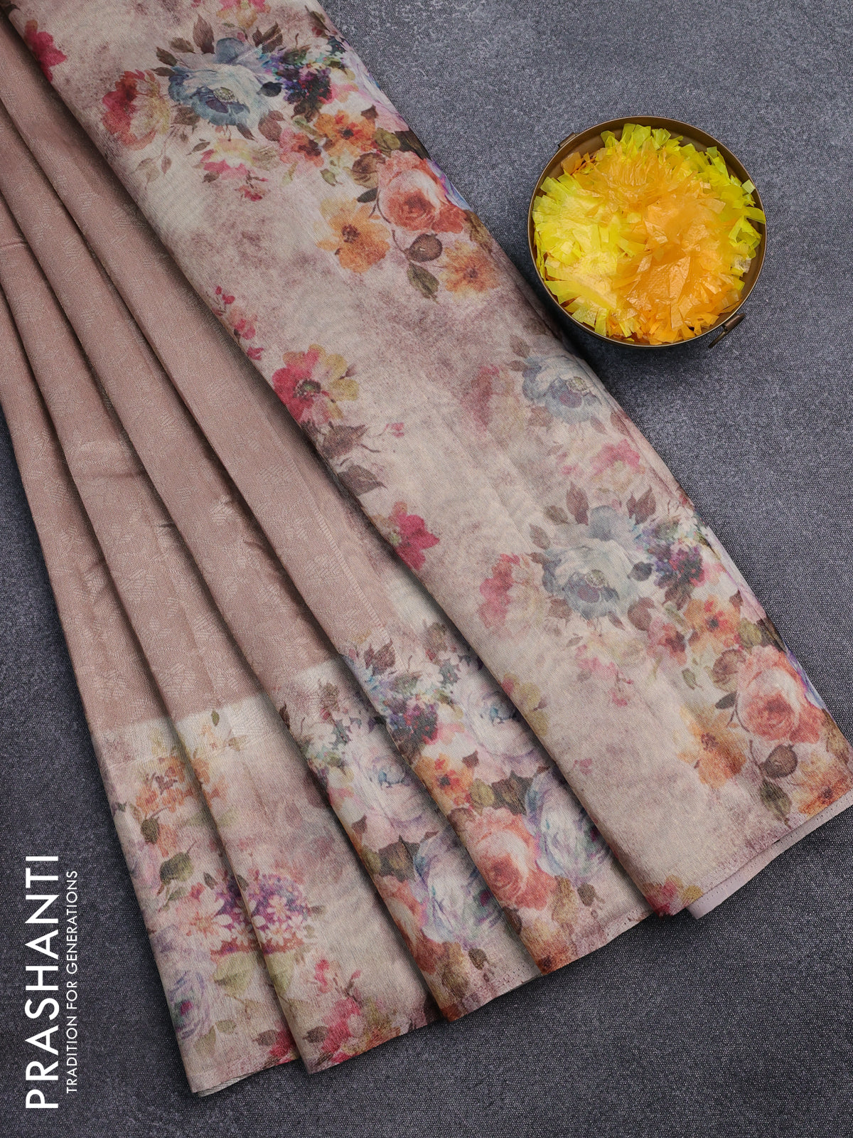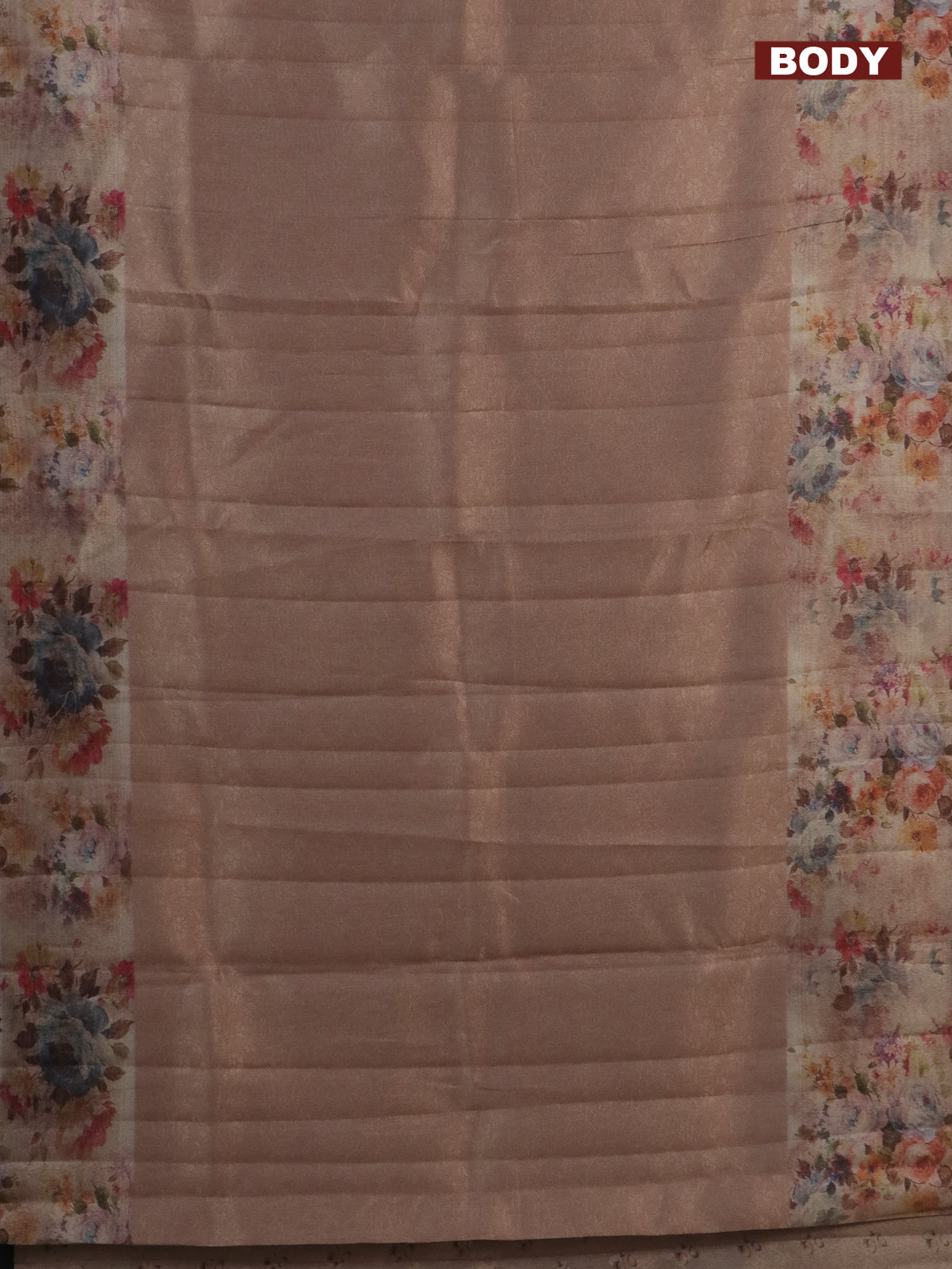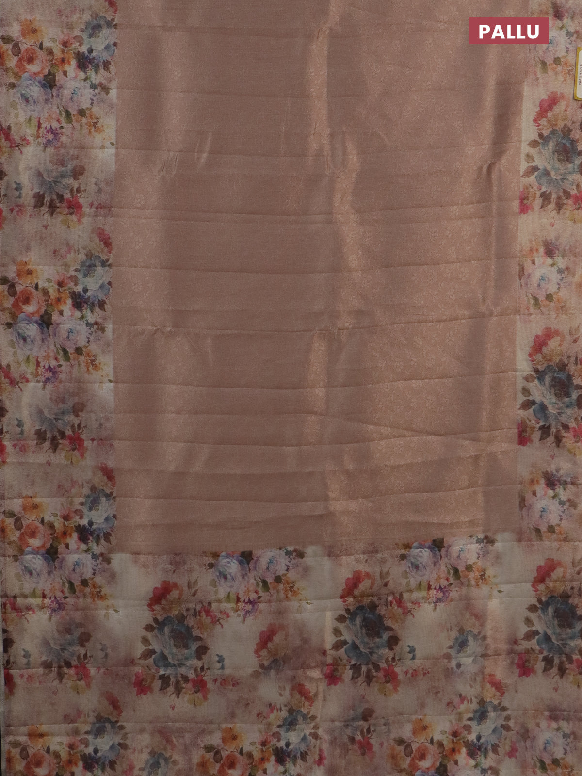 Tissue saree mild peach with allover zari weaves and floral digital printed border