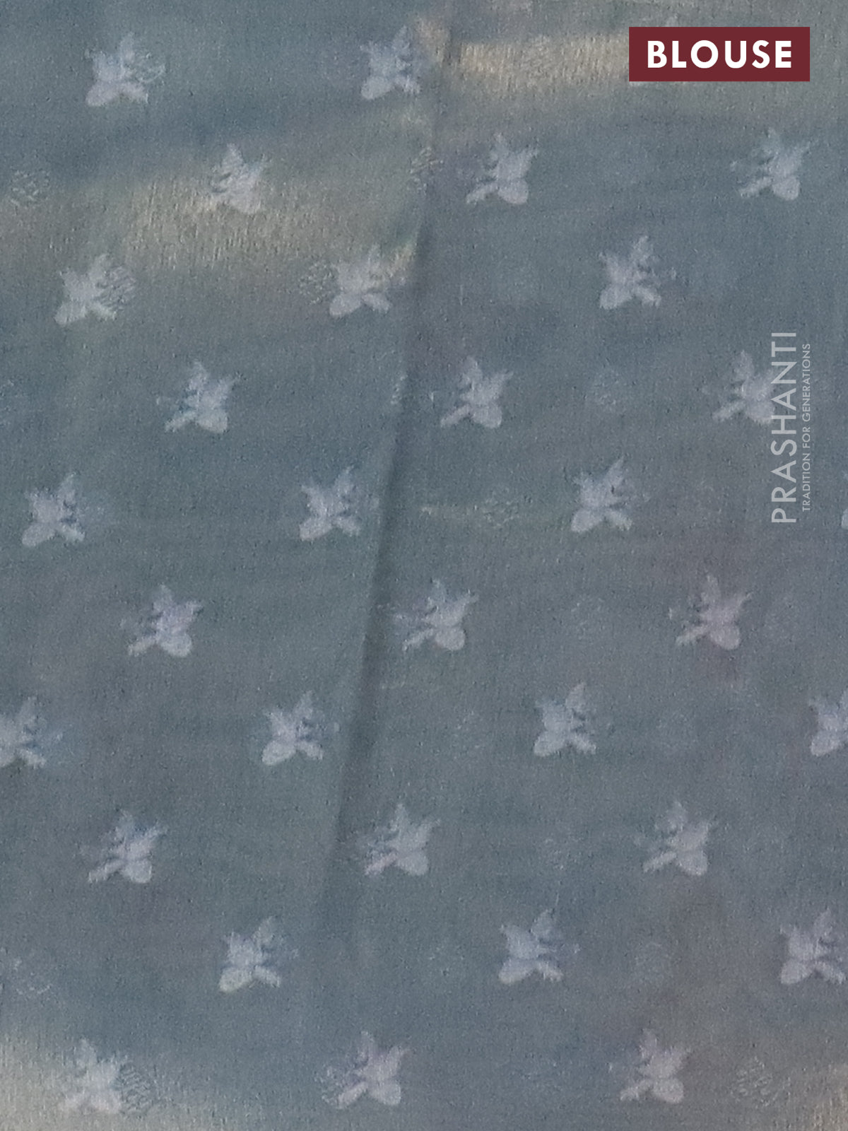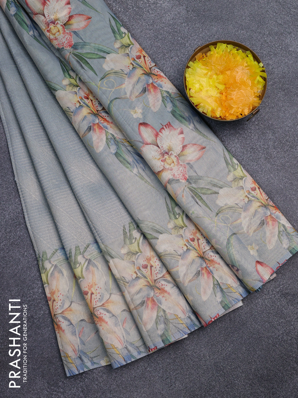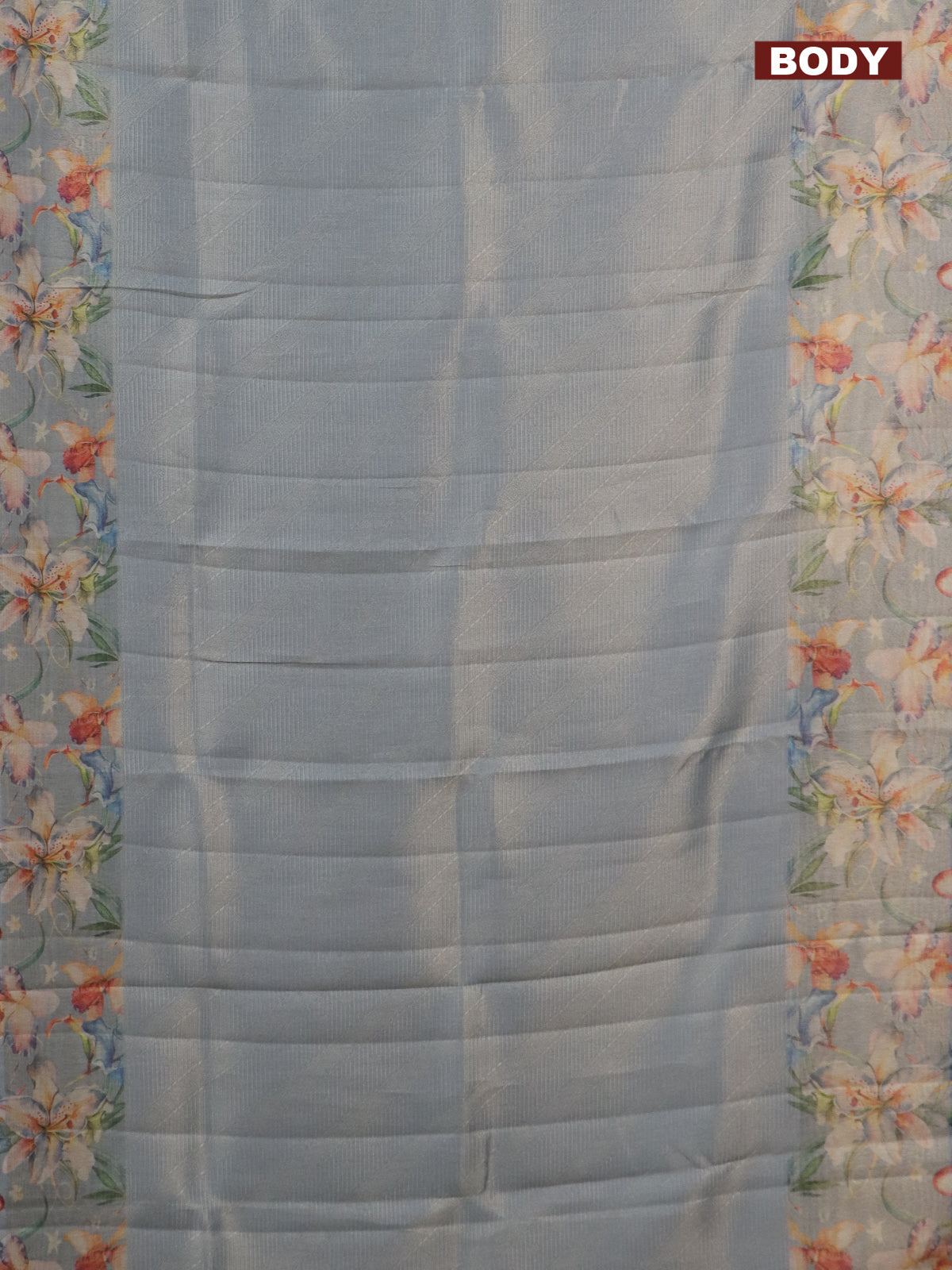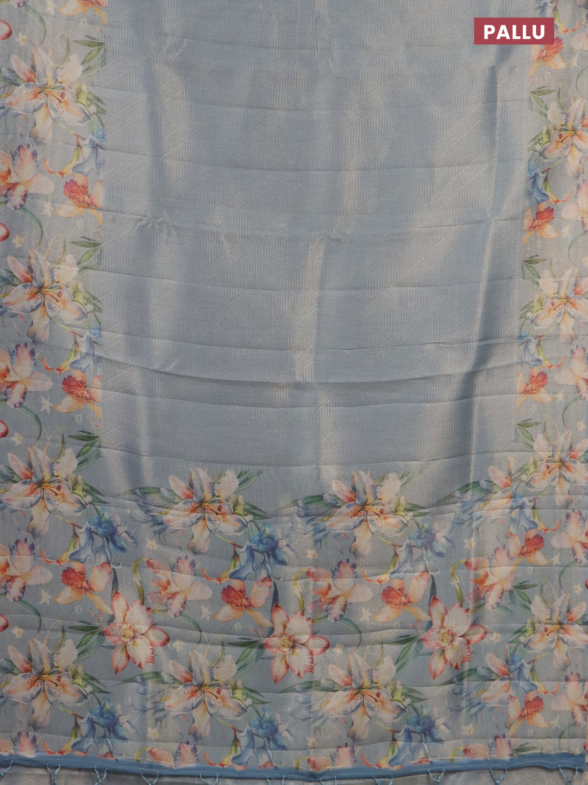 Tissue saree pastel blue with allover zari weaves and floral digital printed border