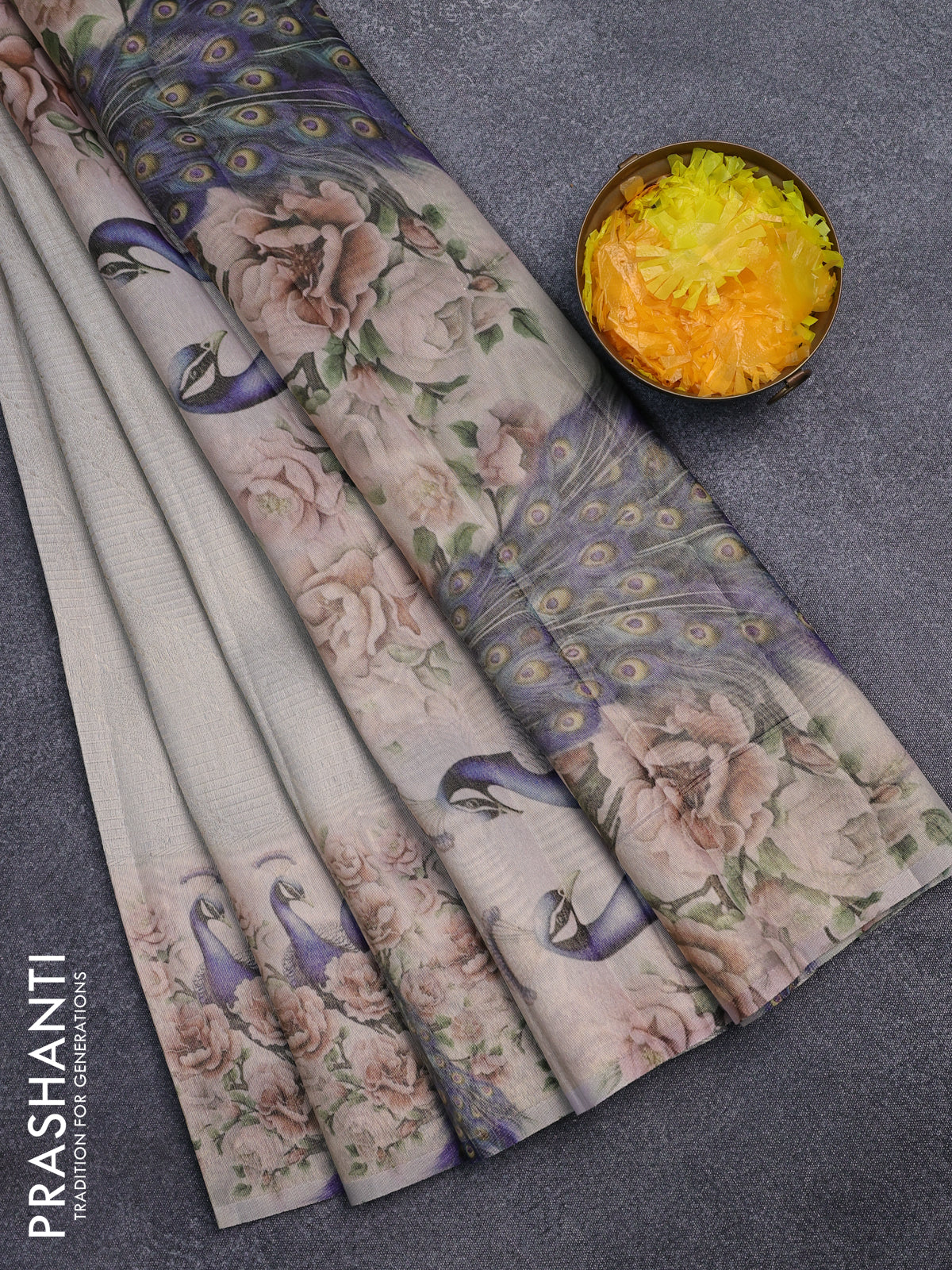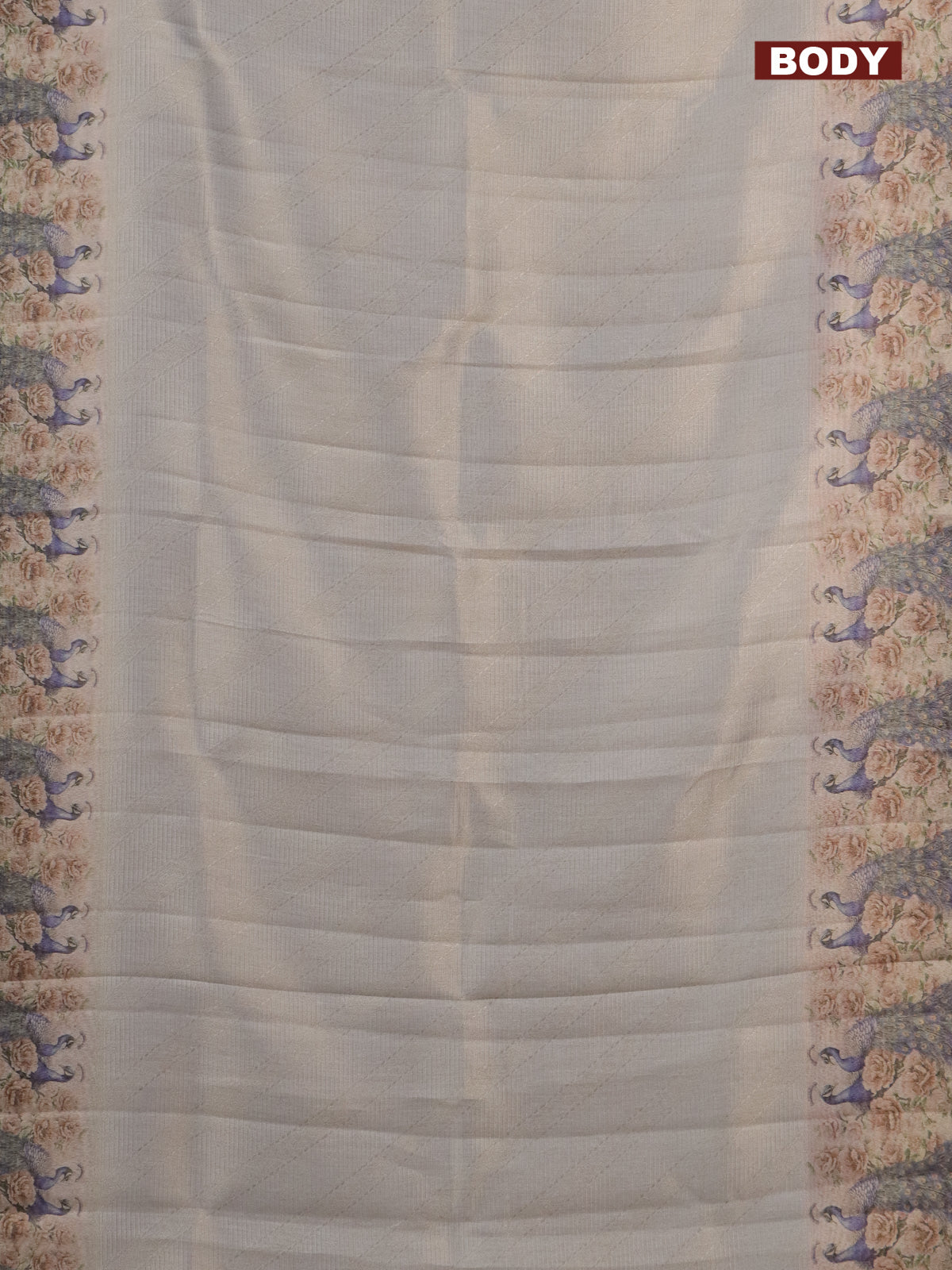 Tissue saree pastel grey and green shade with allover zari weaves and digital printed border