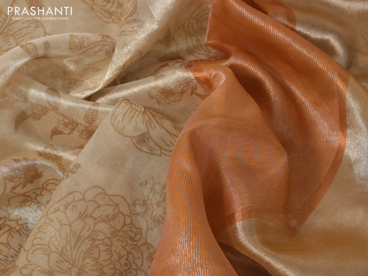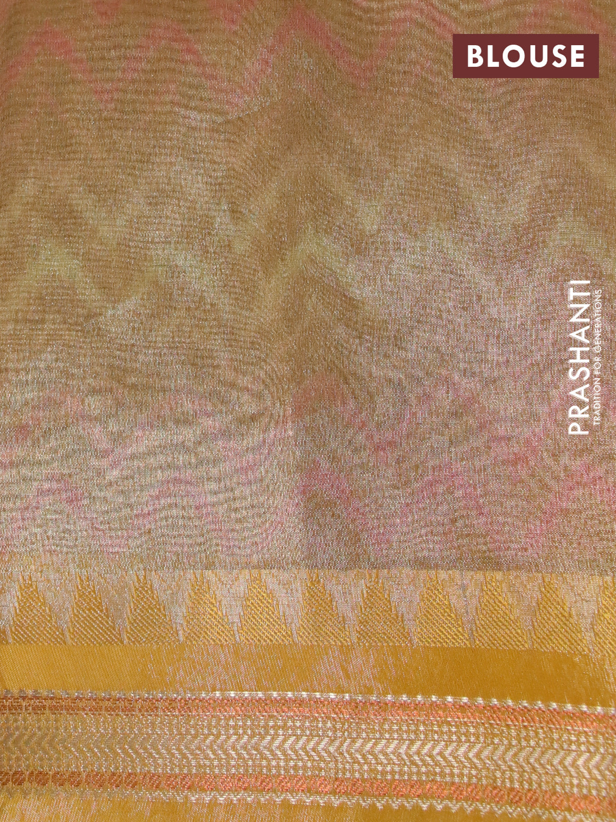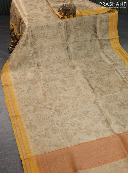 Tissue saree sandal and yellow with allover floral digital prints and temple design zari woven border