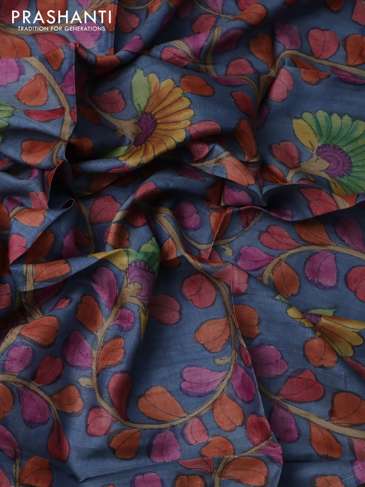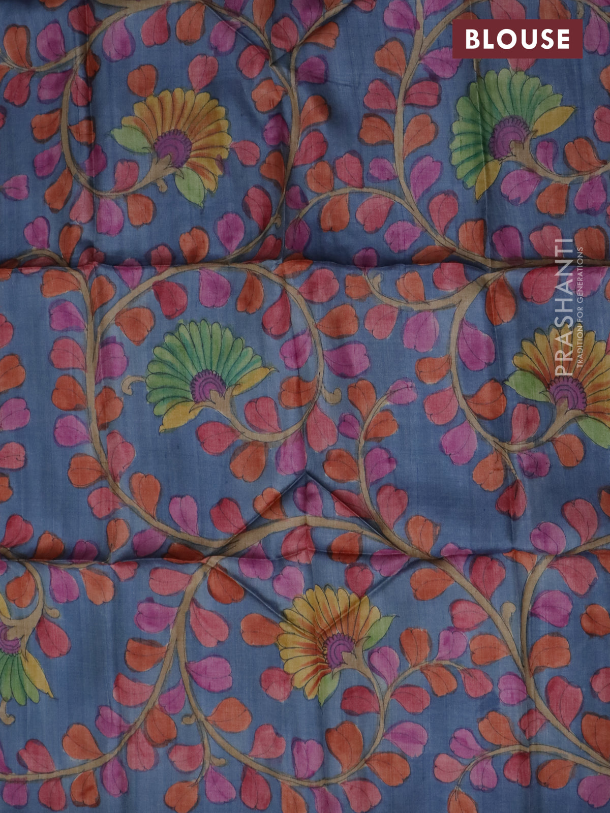 Tussar blouse piece bluish grey with kalamkari hand painted prints