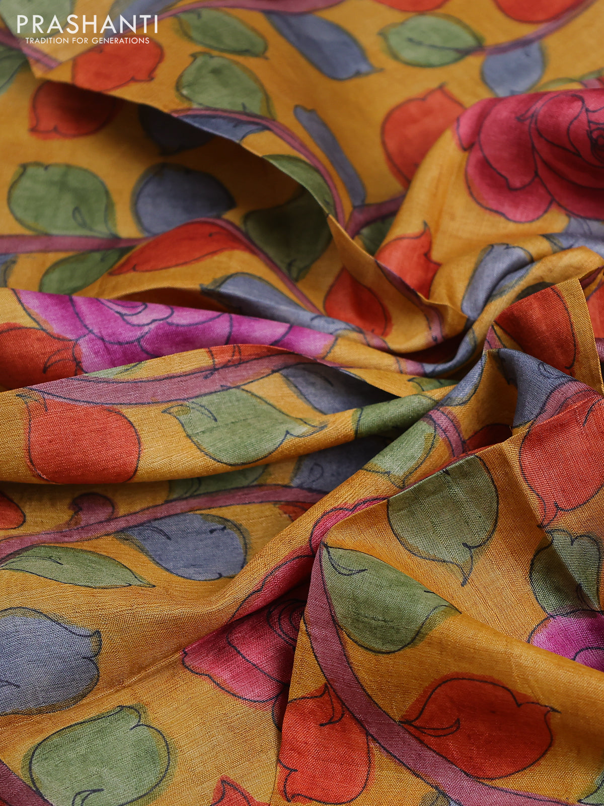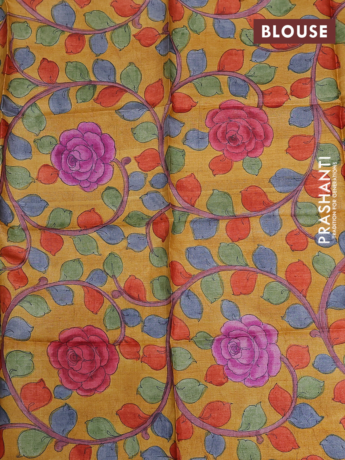 Tussar hand painted blouse piece mustard yellow with kalamkari prints