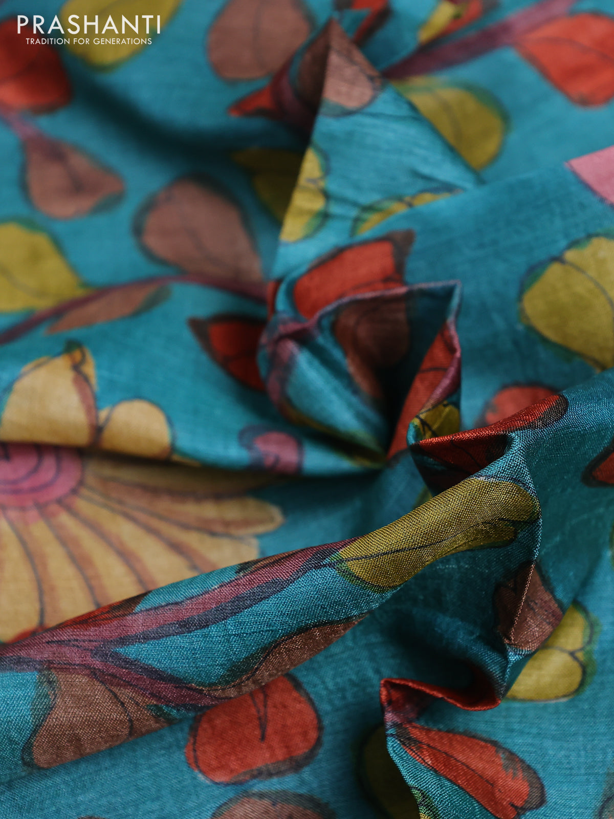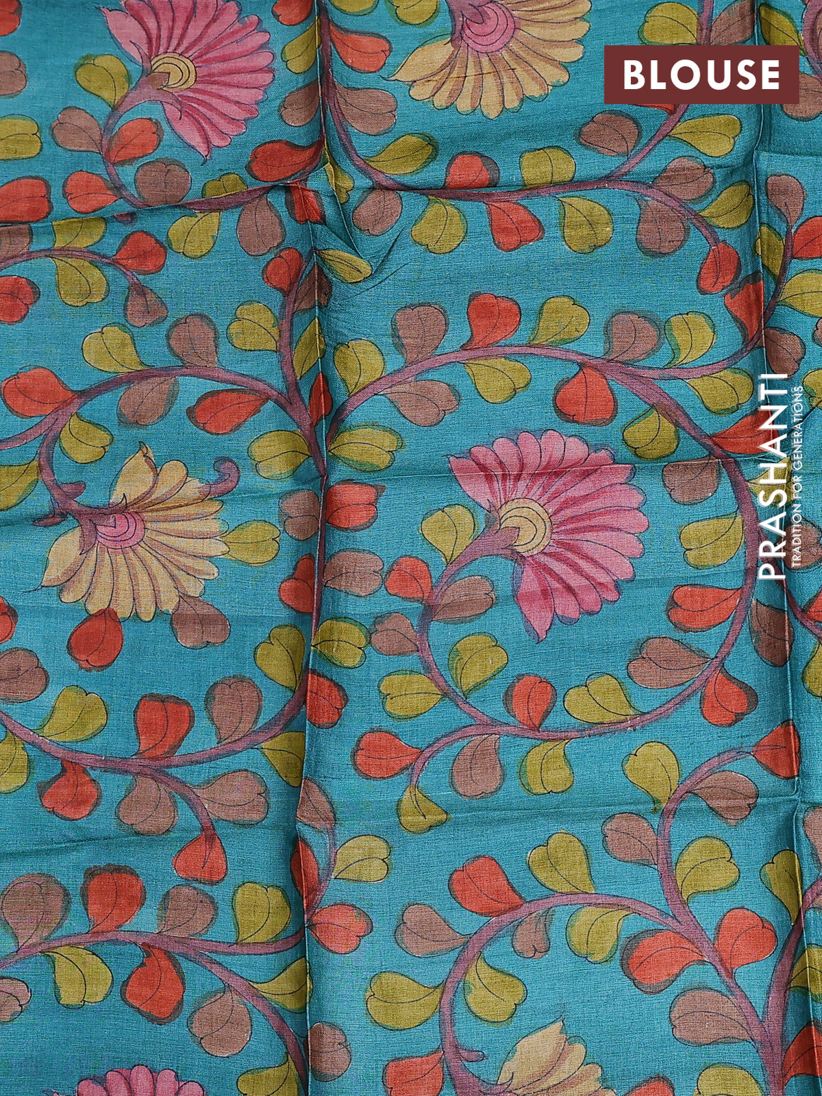 Tussar hand painted blouse piece teal blue with allover kalamkari prints
