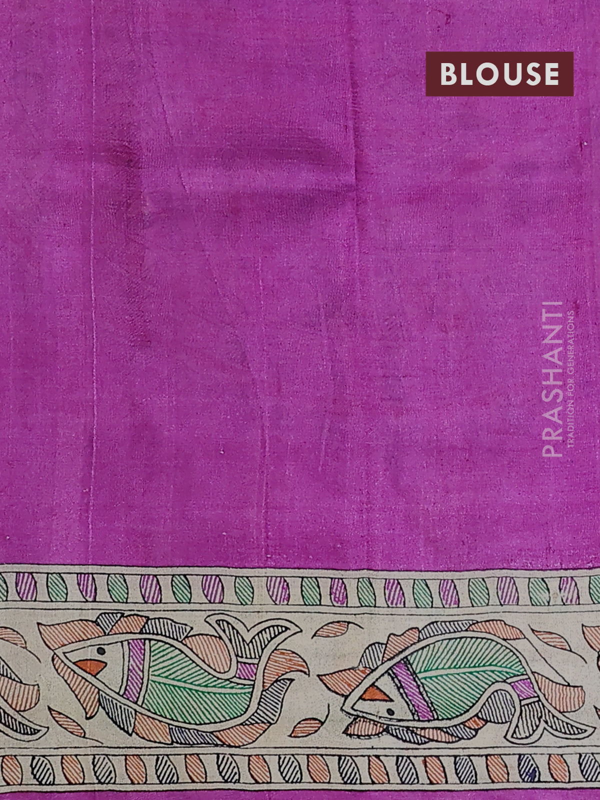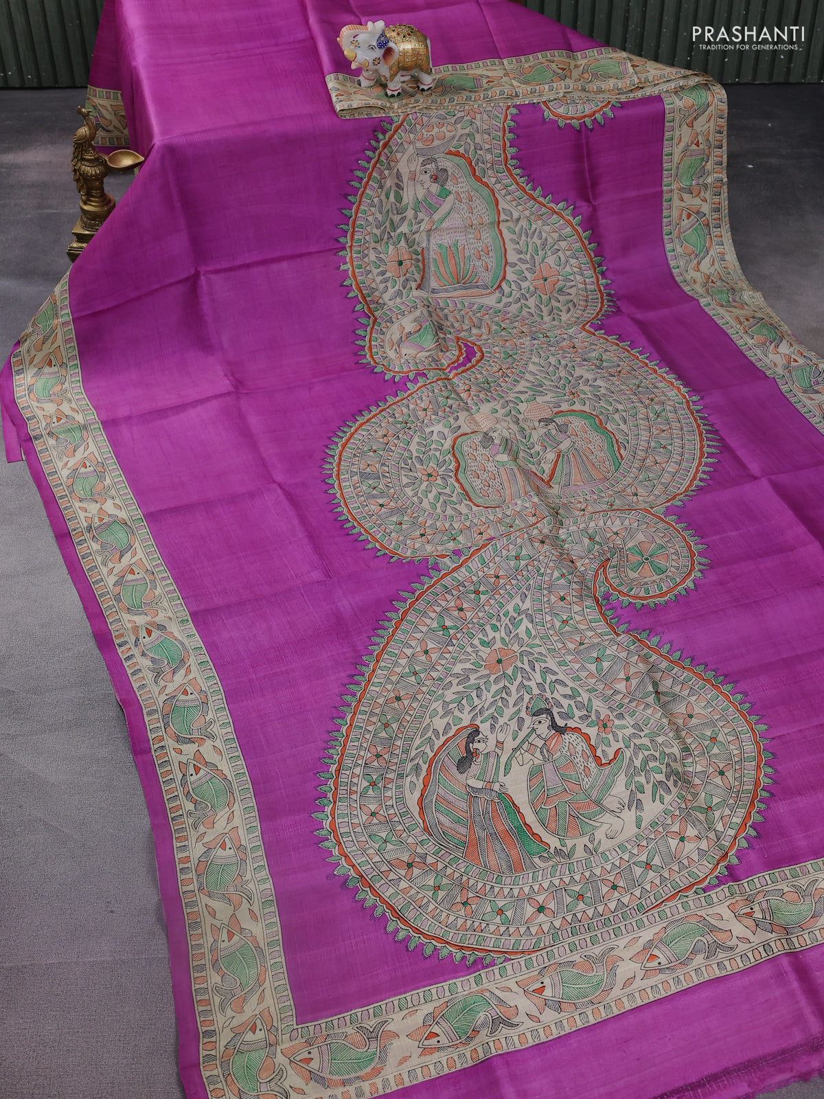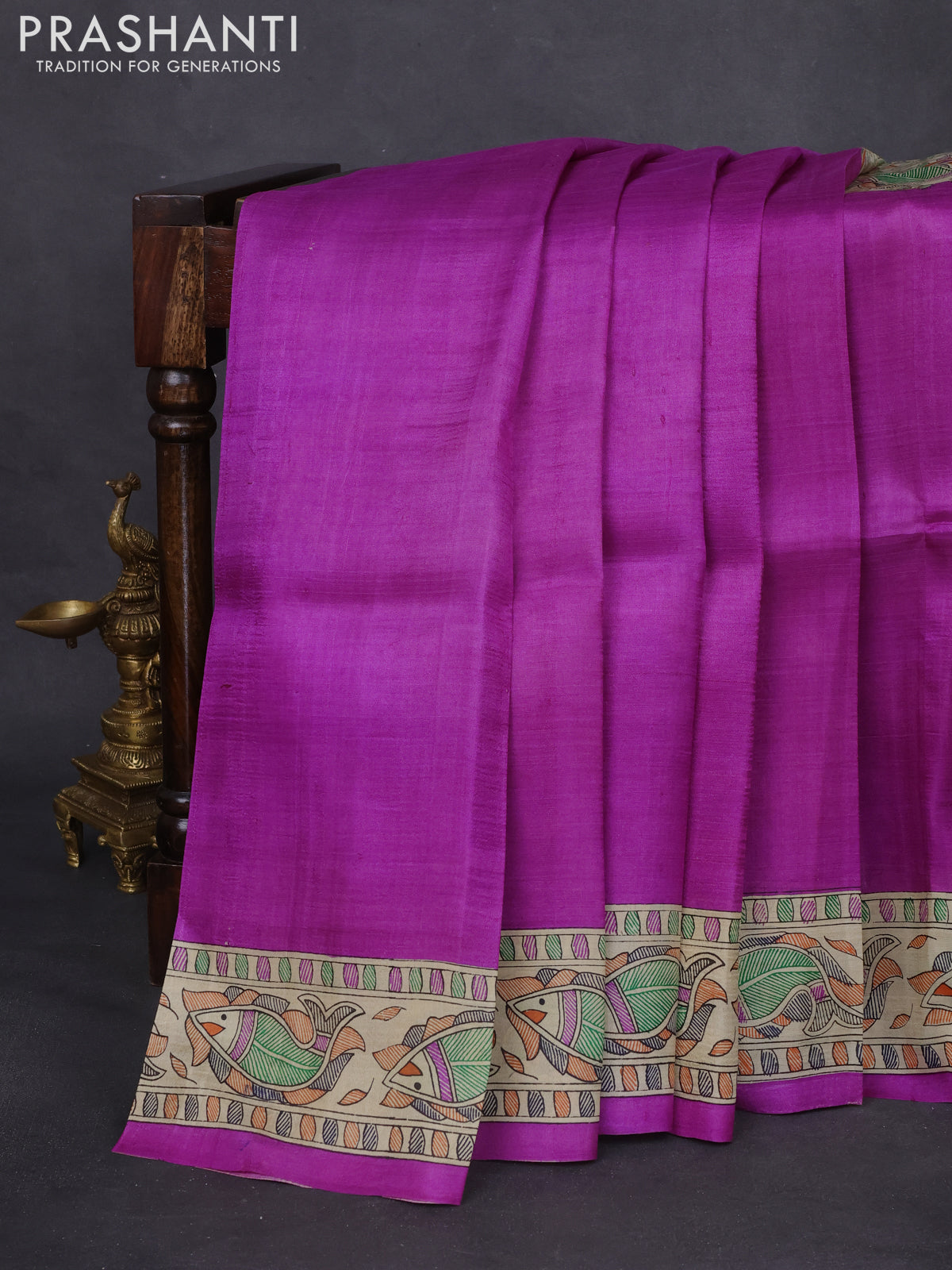 Madhubani printed silk saree purple and cream with allover prints and printed border