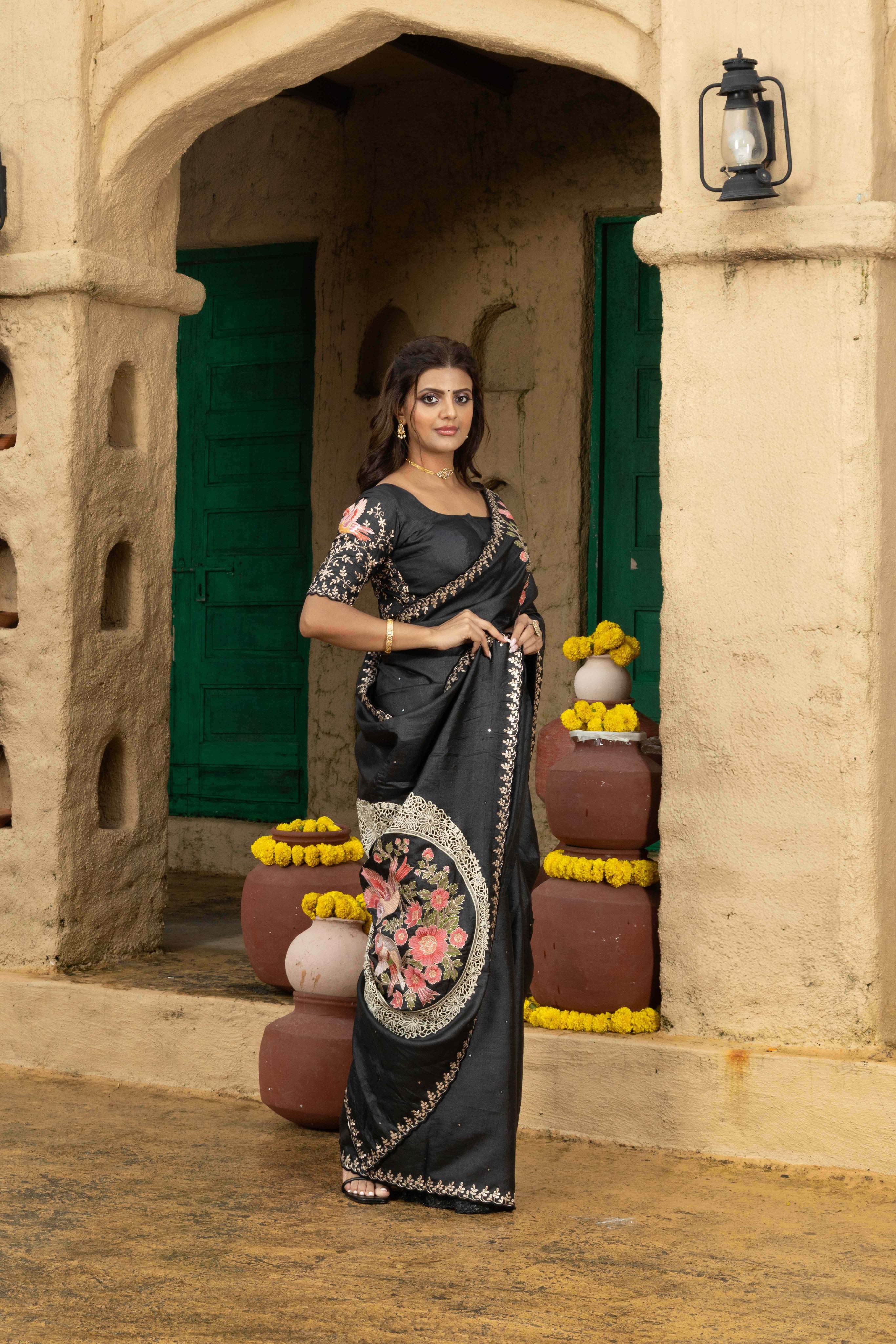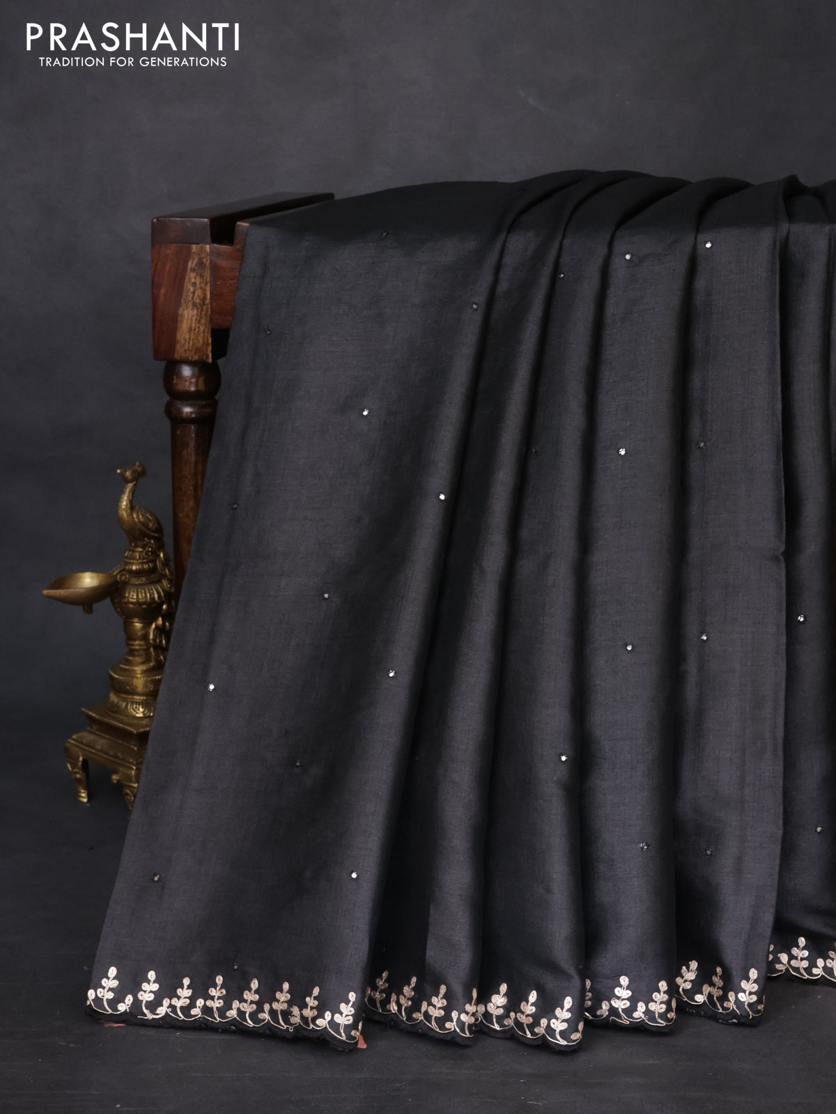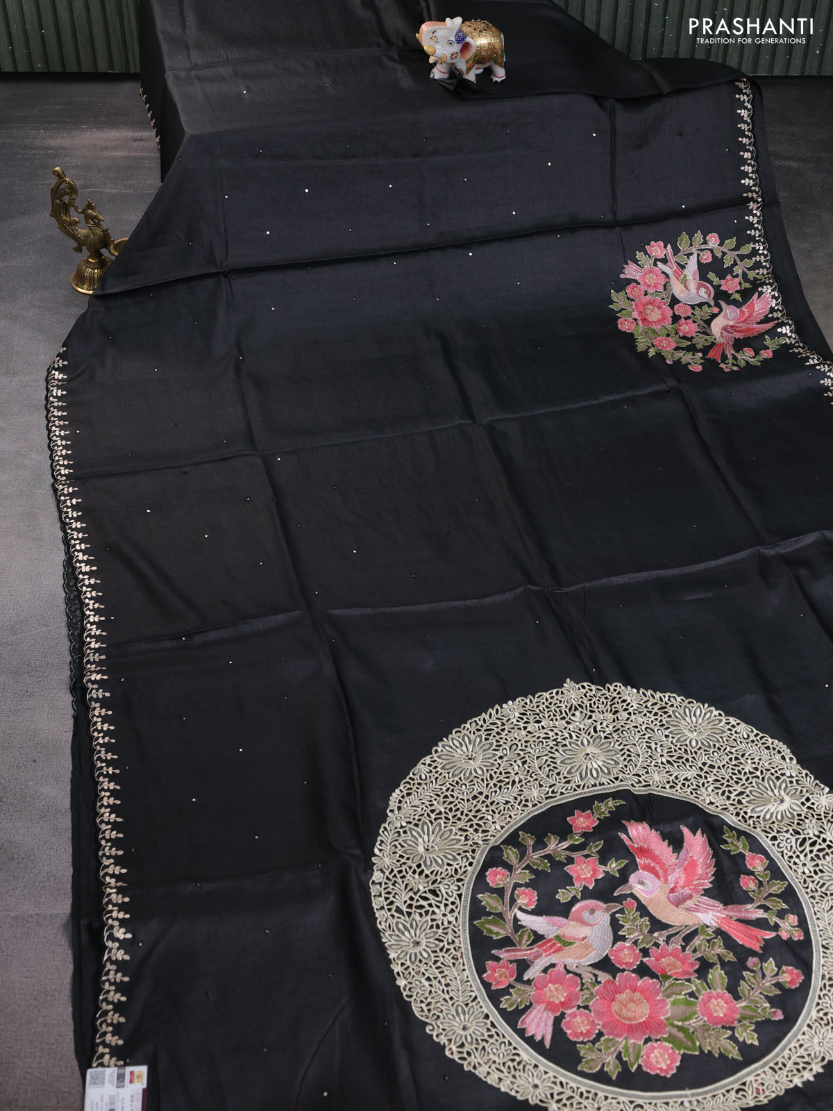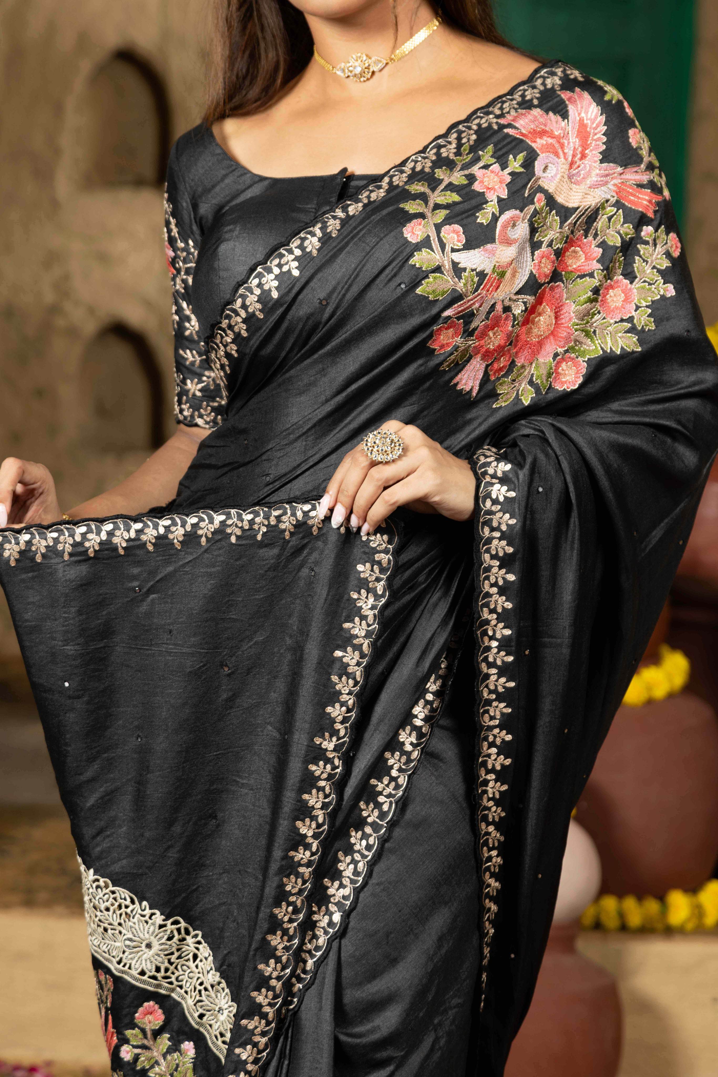 Tussar silk saree black with allover mirror work and placement style embroidery cut work pallu