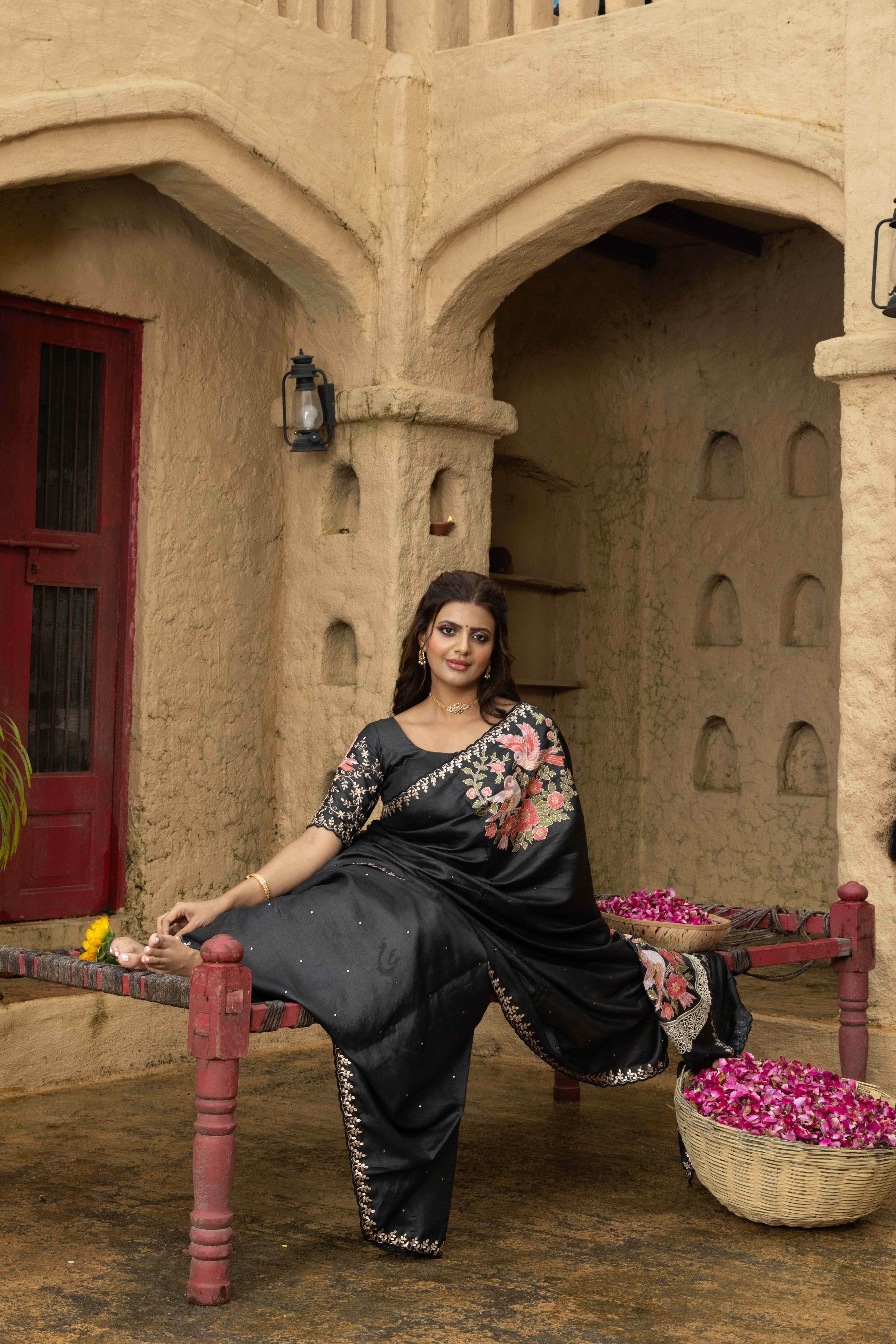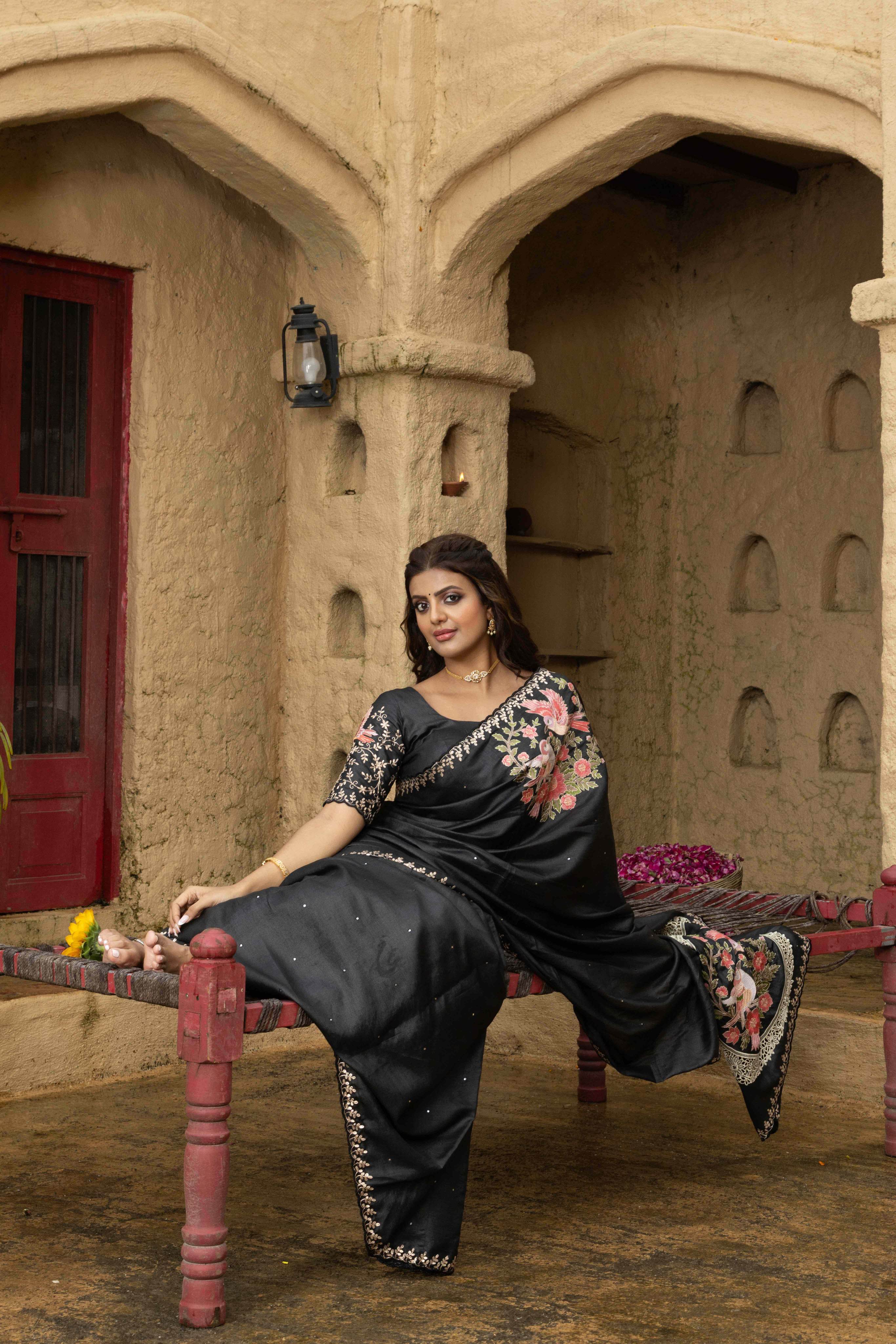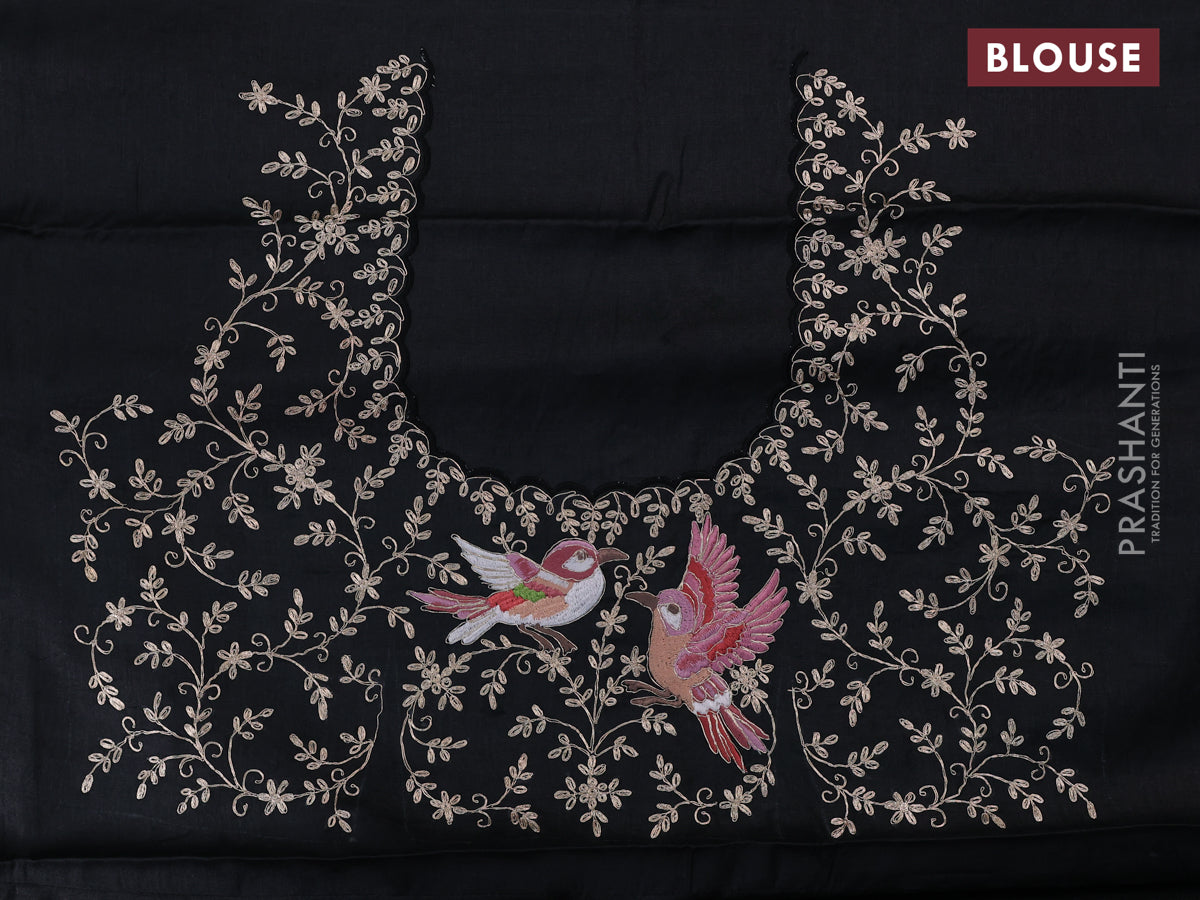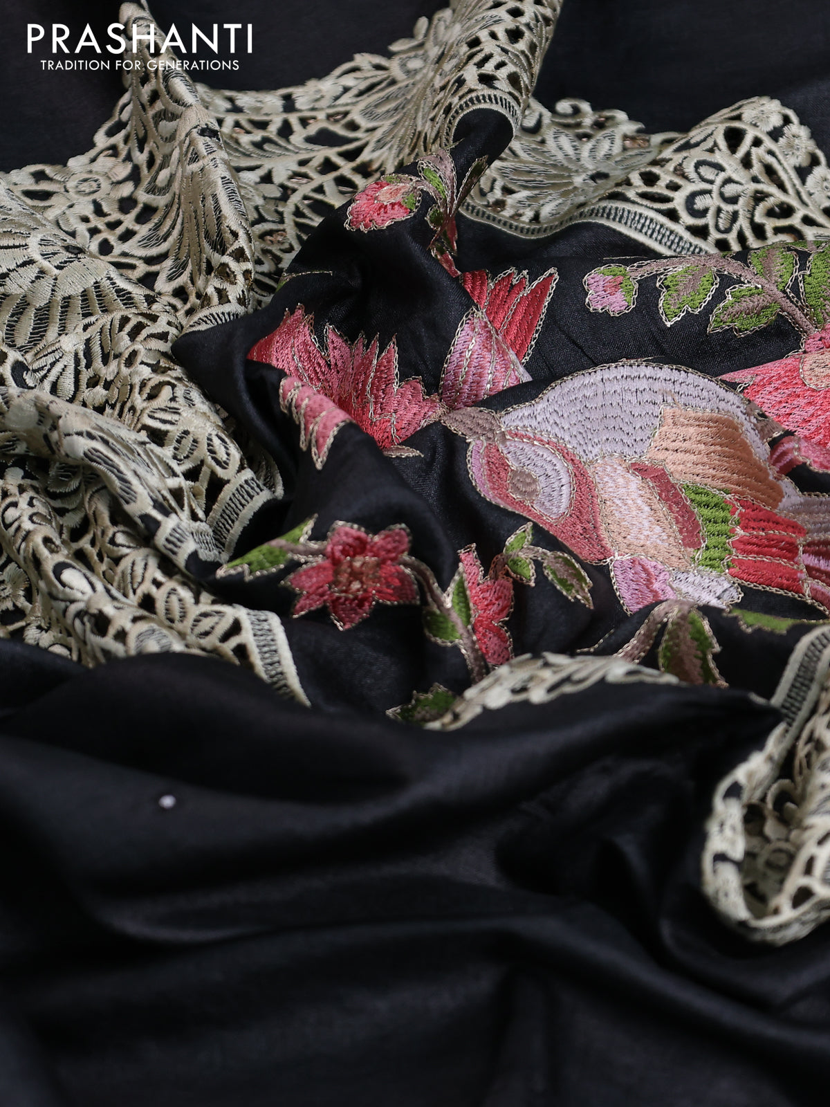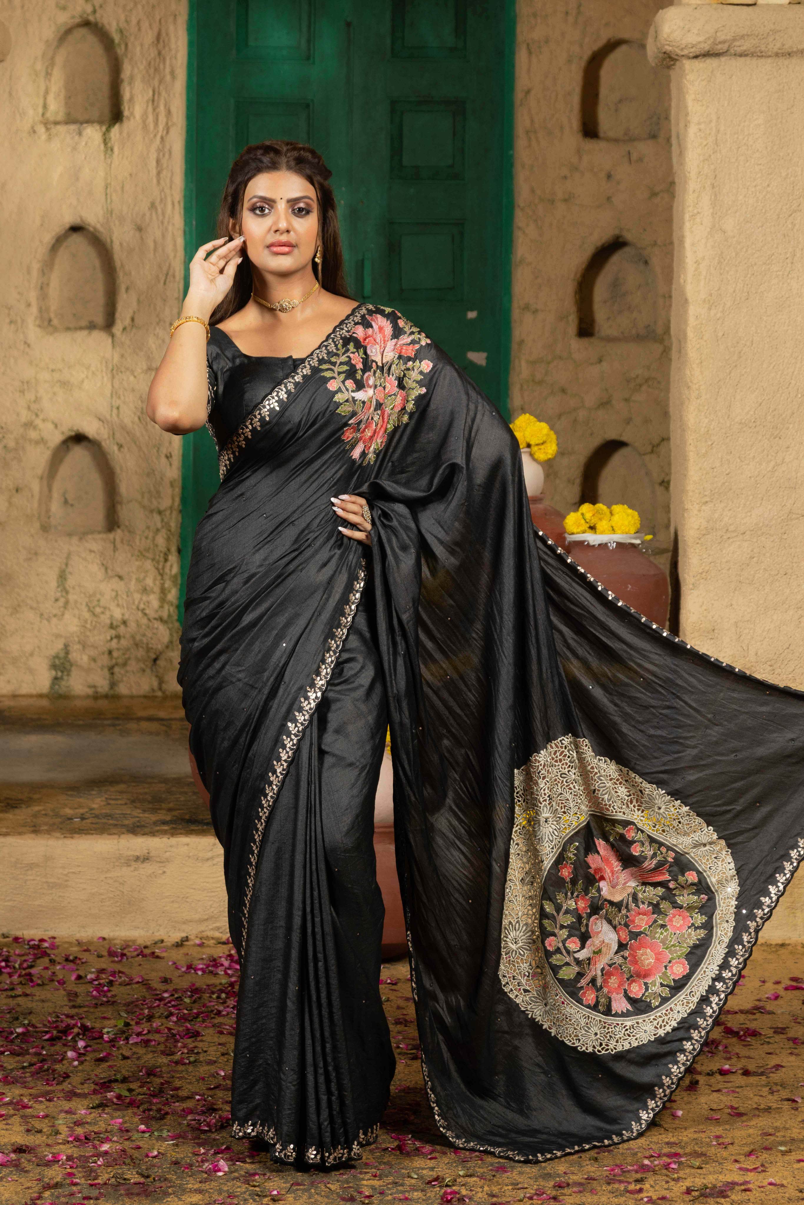 Tussar silk saree black with allover mirror work and placement style embroidery cut work pallu