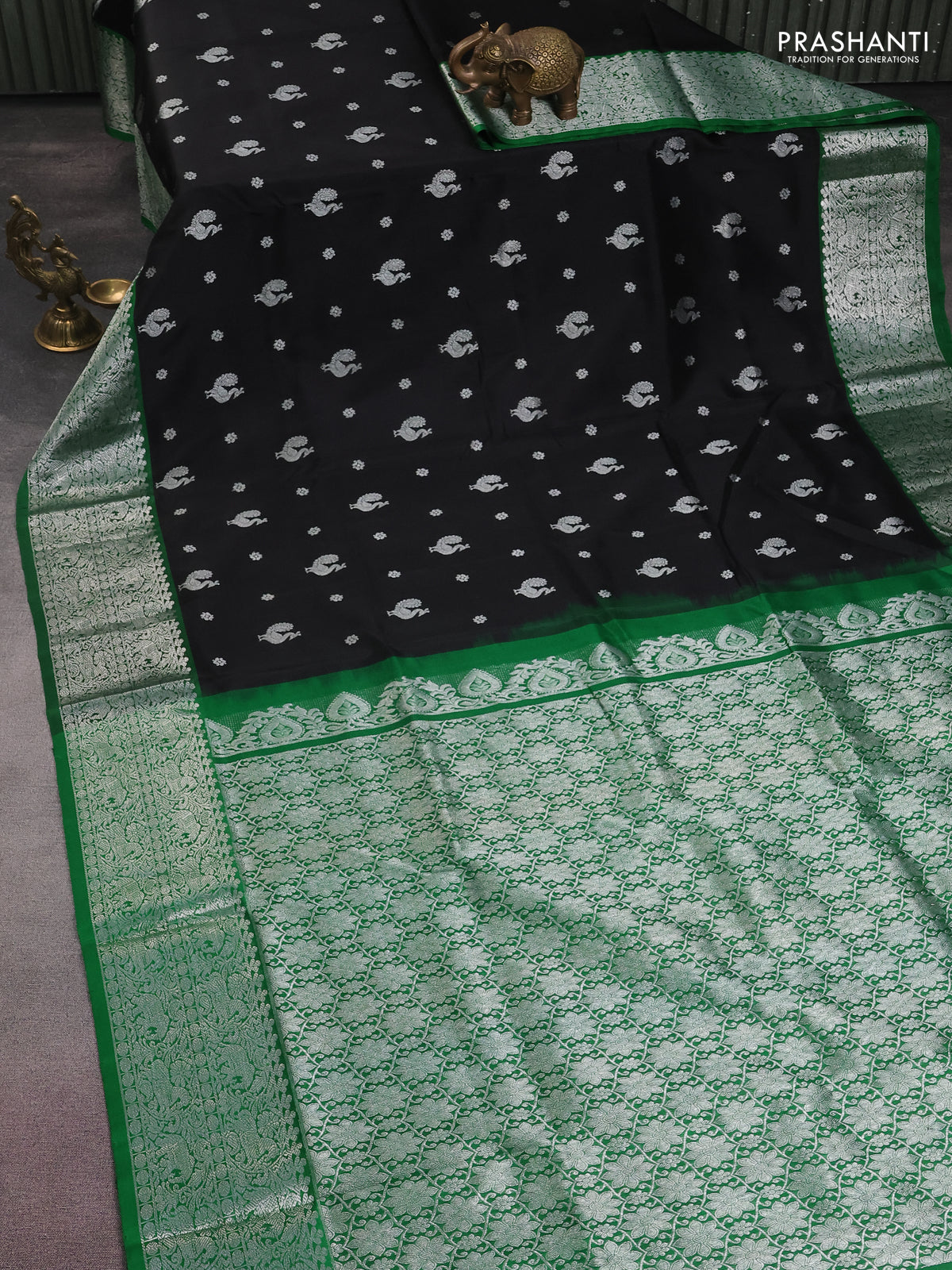 Venkatagiri silk saree black and green with silver zari woven buttas and silver zari woven border