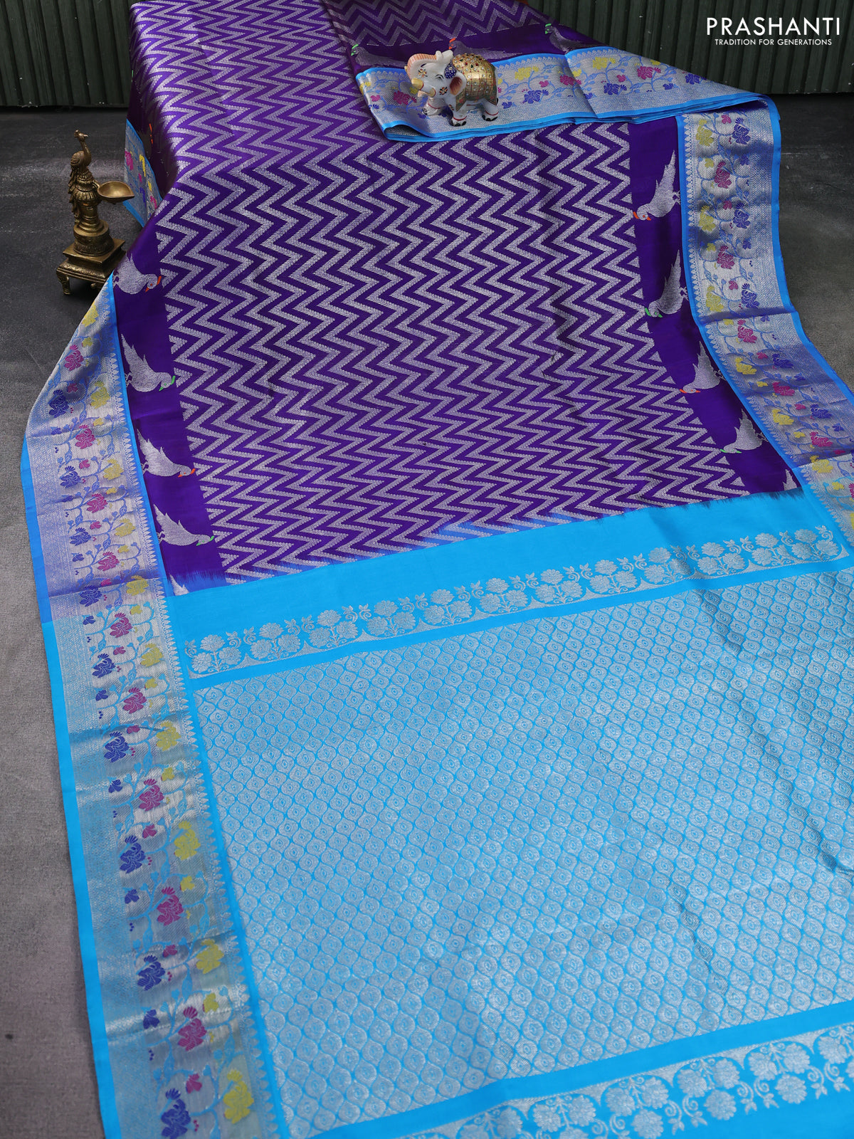 Venkatagiri silk saree blue and cs blue with allover zig zag silver zari weaves and silver zari woven paithani border