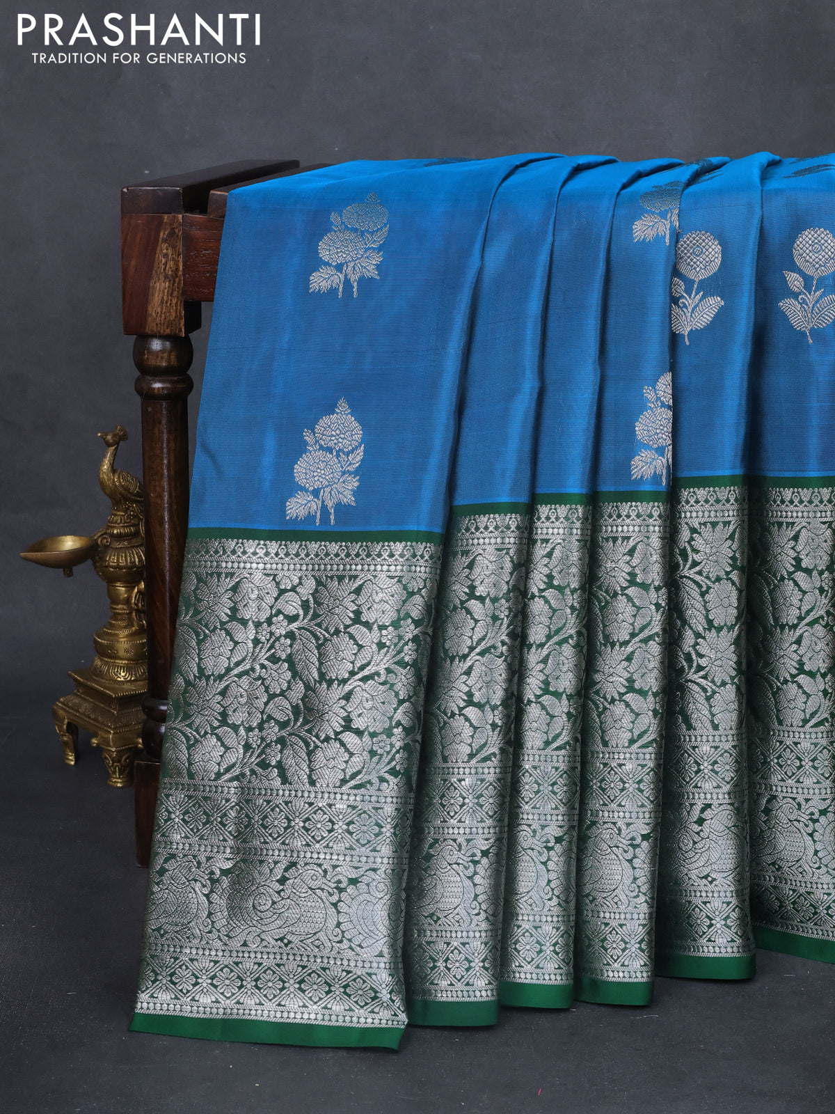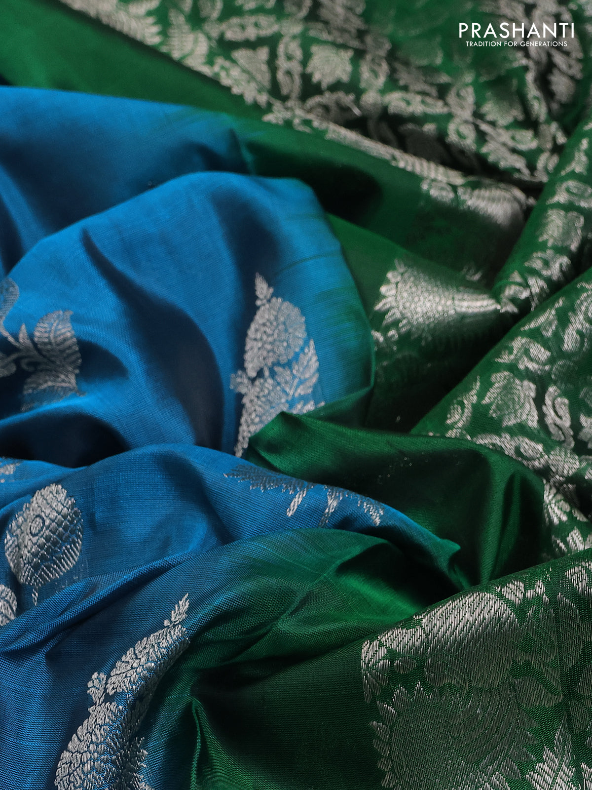 Venkatagiri silk saree cs blue and green with silver zari woven floral buttas and long silver zari woven border