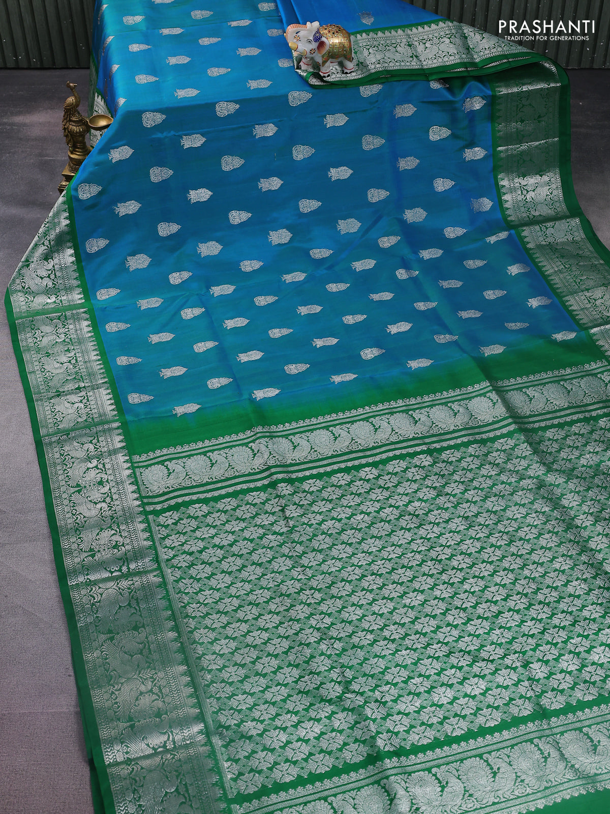 Venkatagiri silk saree dual shade of bluish green and green with silver zari woven buttas and silver zari woven border