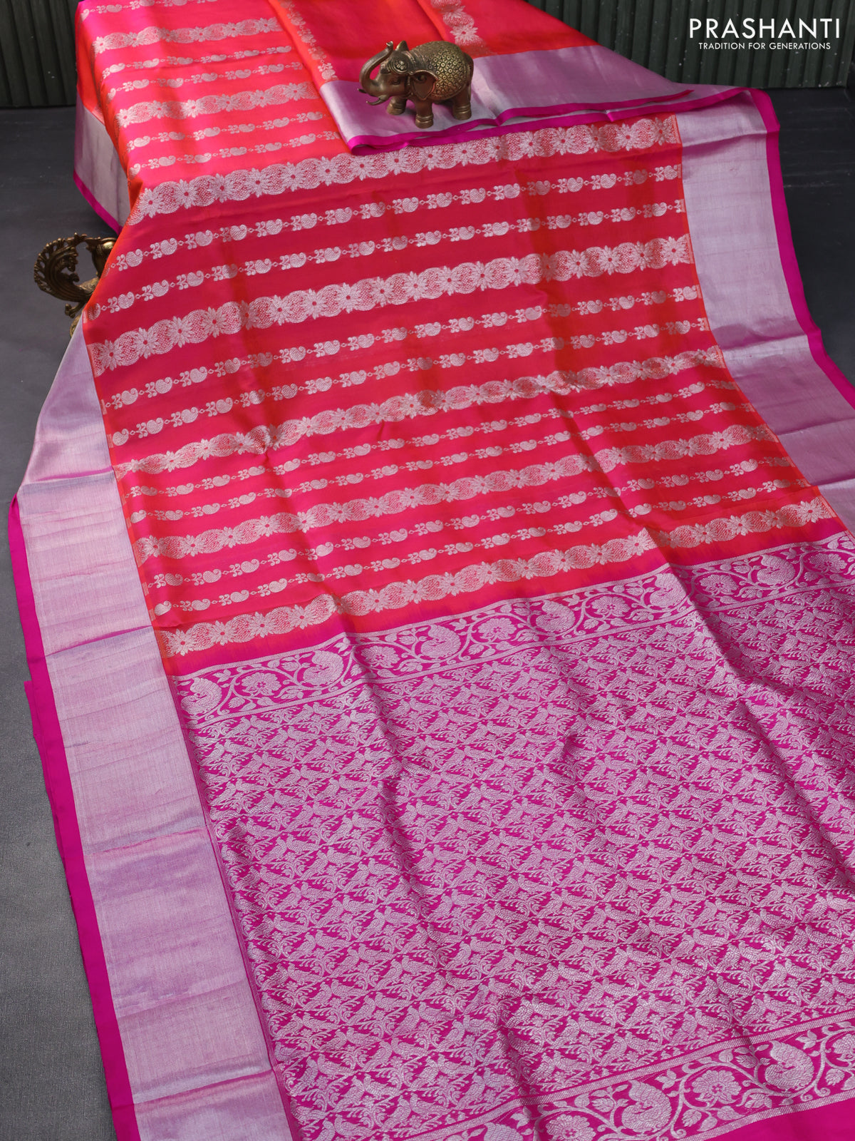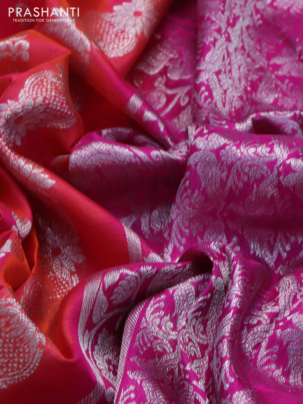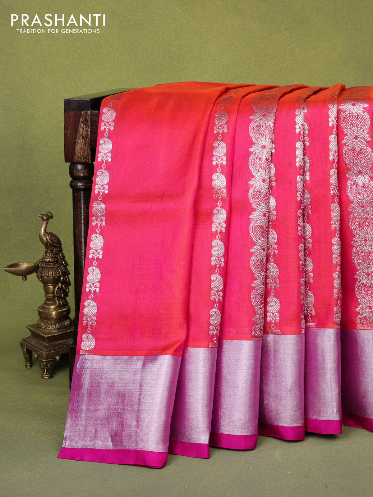 Venkatagiri silk saree dual shade of pinkish orange and pink with allover silver zari weaves and silver zari woven border