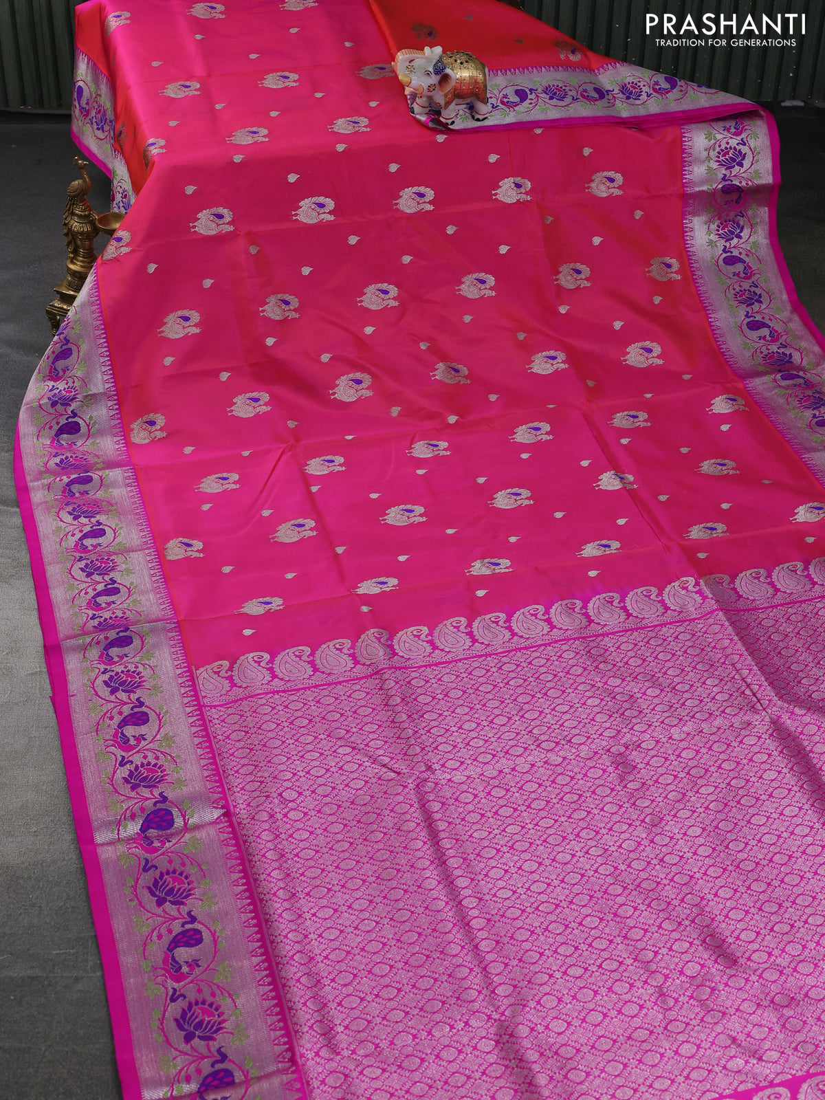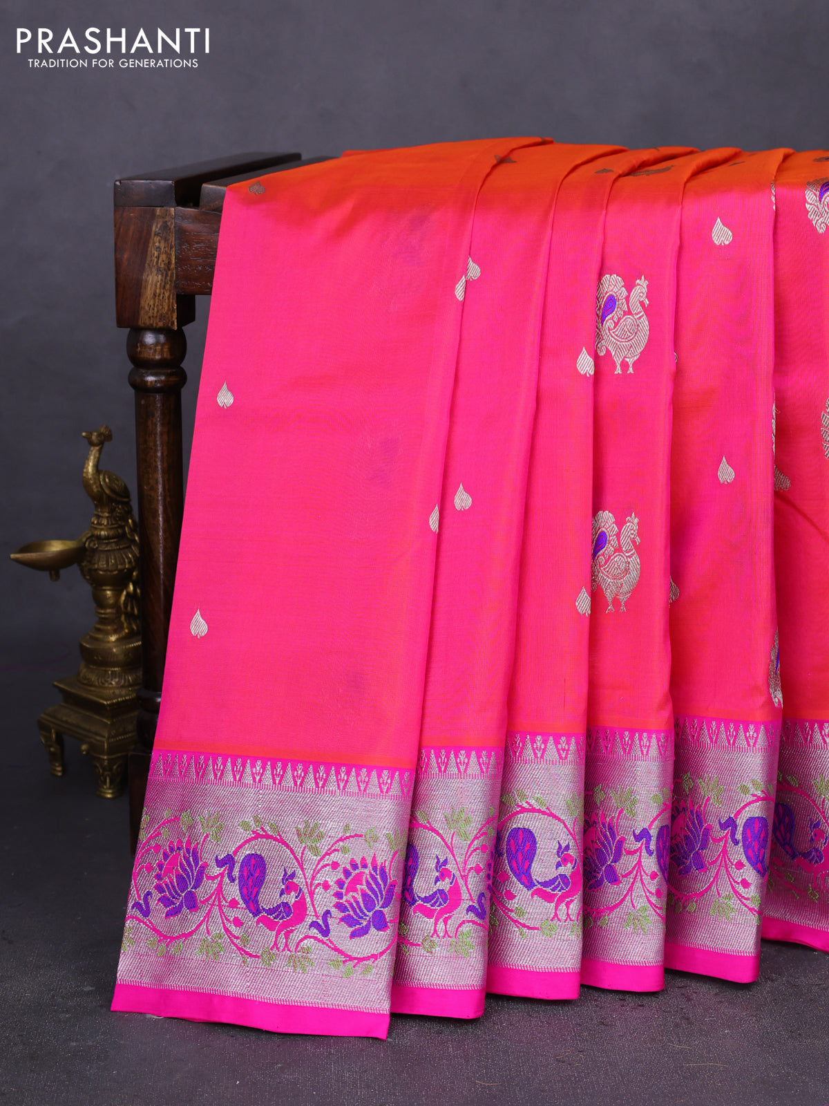Venkatagiri silk saree dual shade of pinkish orange and pink with annam zari woven buttas and silver zari woven paithani style border