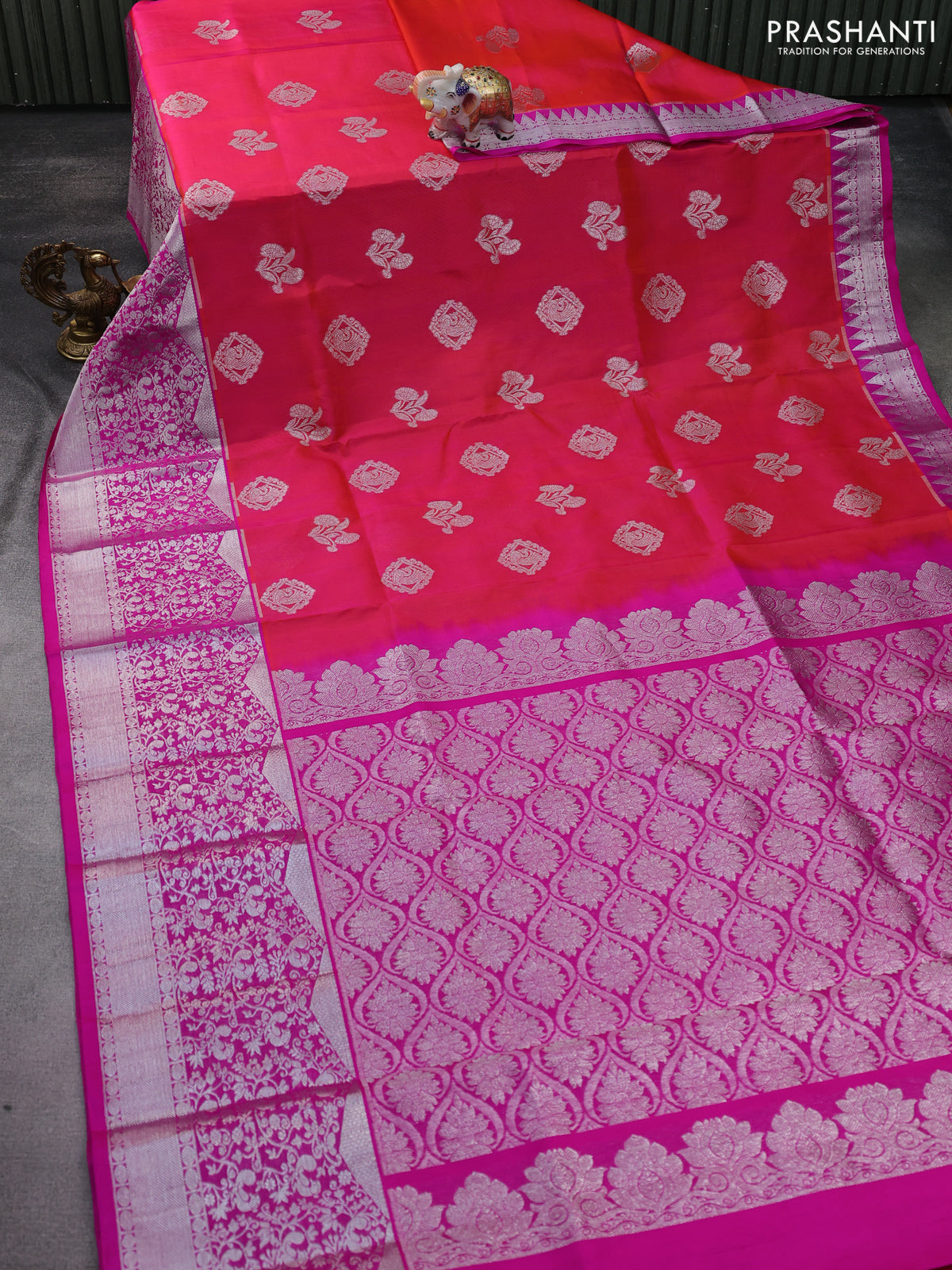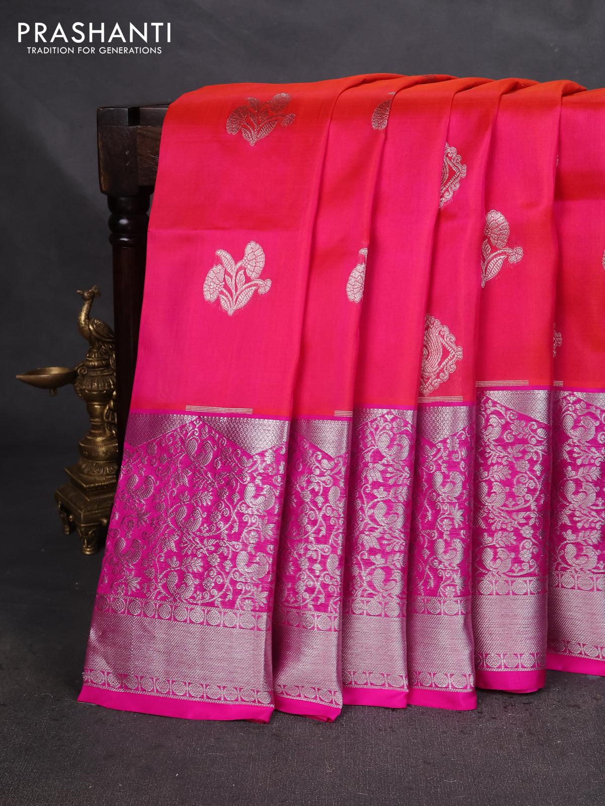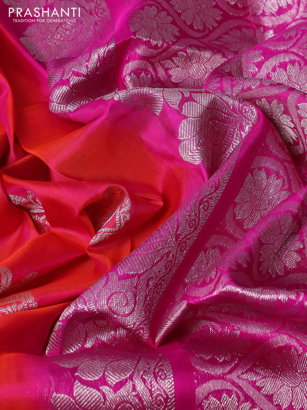Venkatagiri silk saree dual shade of pinkish orange and pink with silver zari woven buttas and long zari woven border