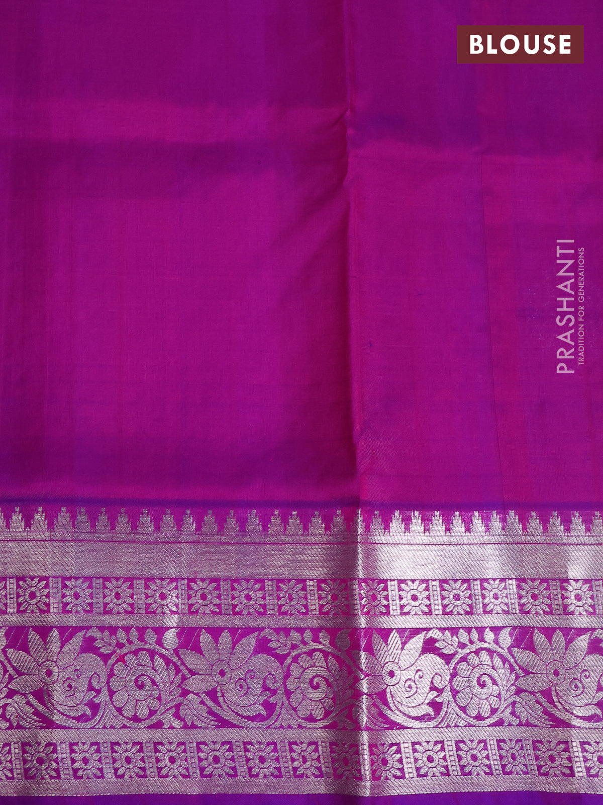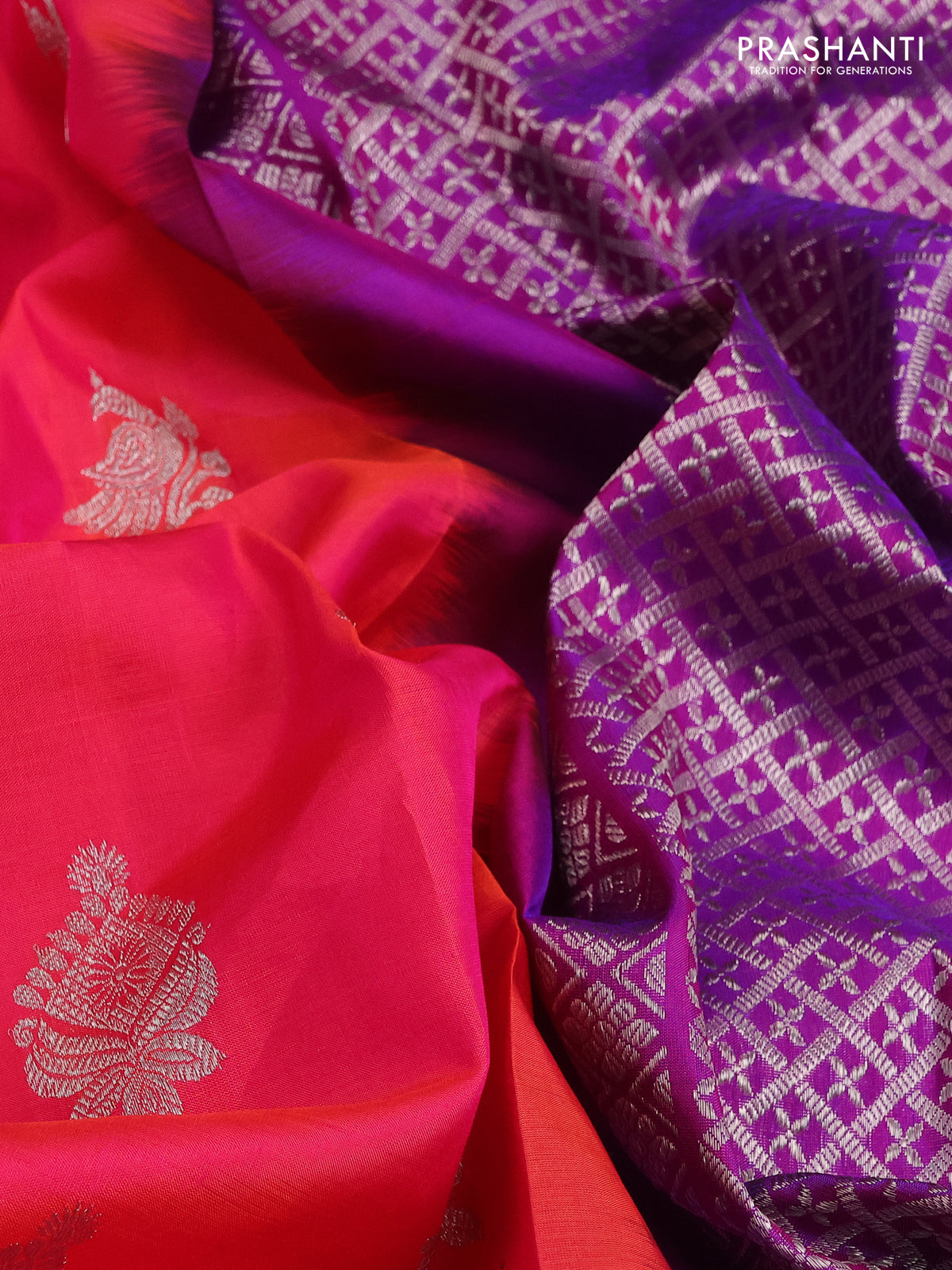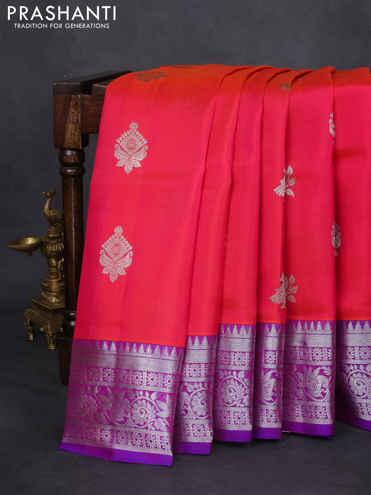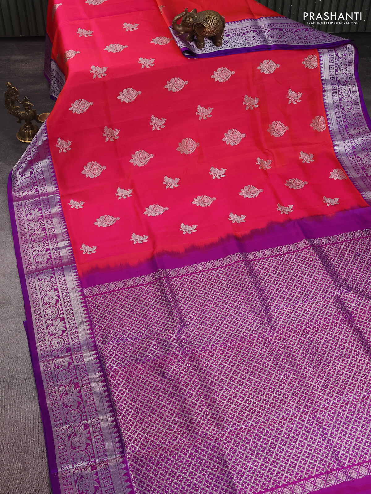 Venkatagiri silk saree dual shade of pinkish orange and purple with silver zari woven buttas and rich silver zari woven border
