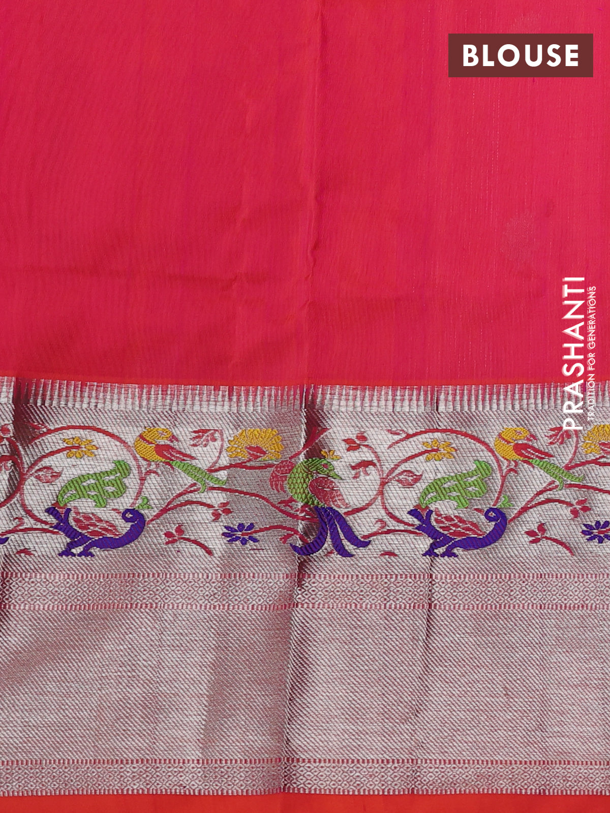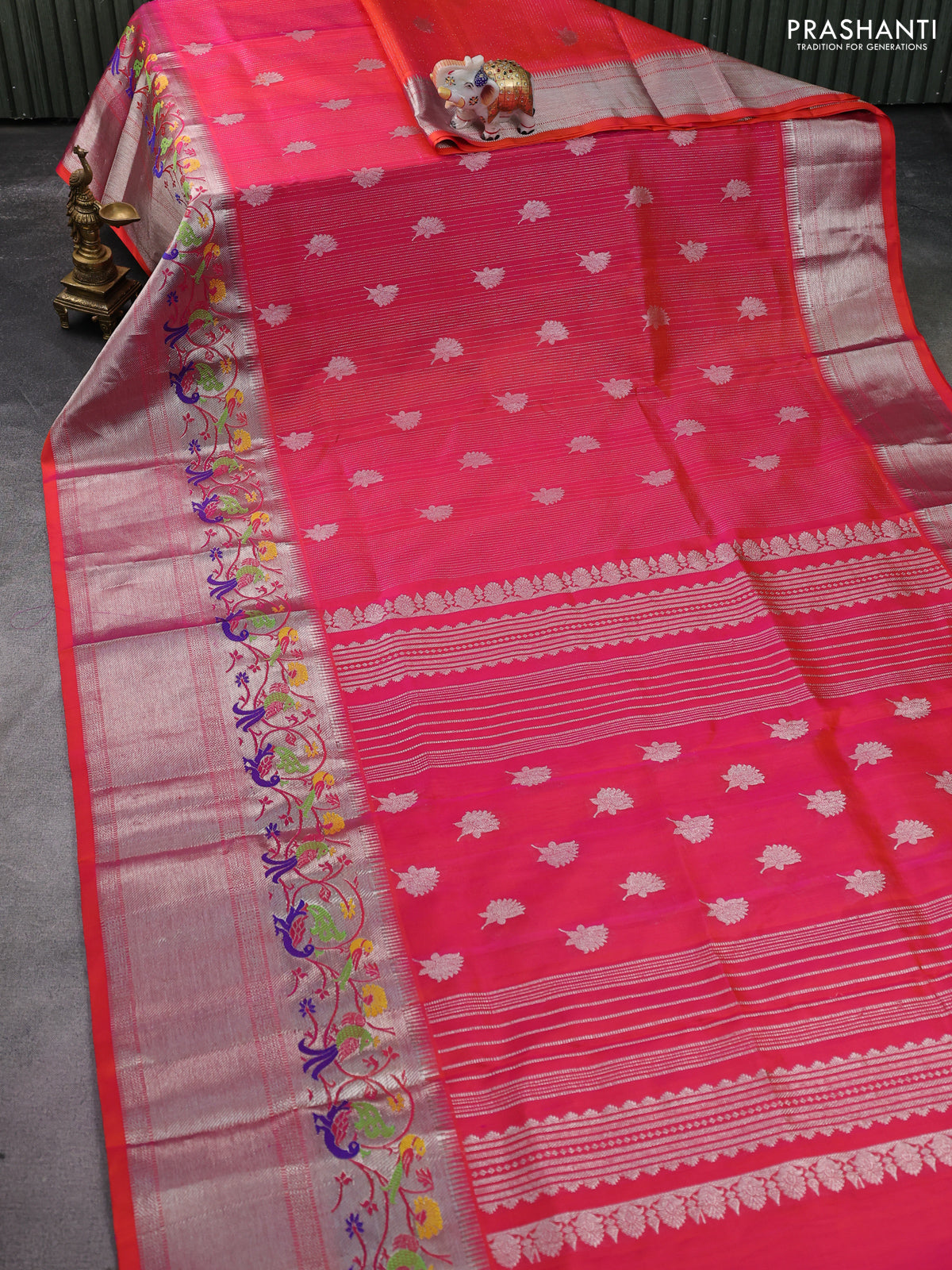 Venkatagiri silk saree dual shade of pinkish orange with allover silver zari stripes & buttas and long silver zari woven paithani style border