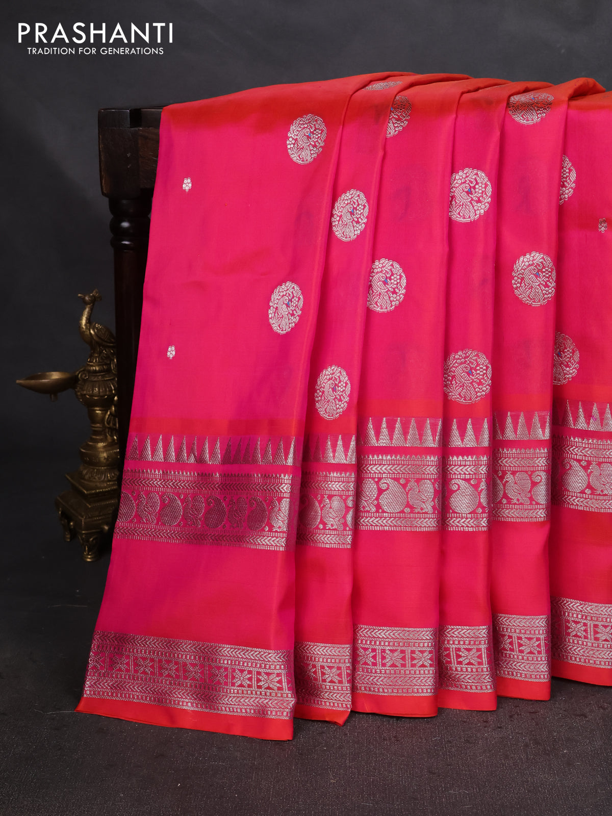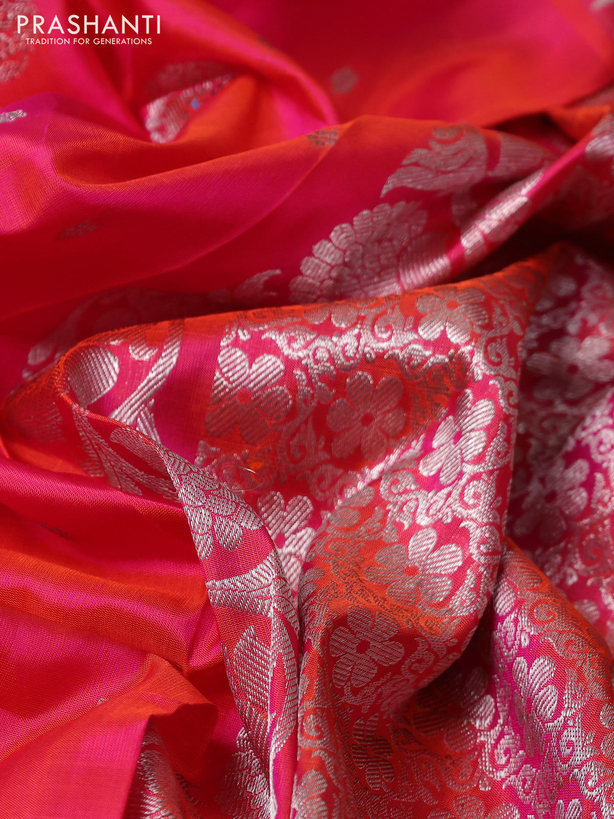 Venkatagiri silk saree dual shade of pinkish orange with silver zari woven buttas and rettapet silver zari woven border
