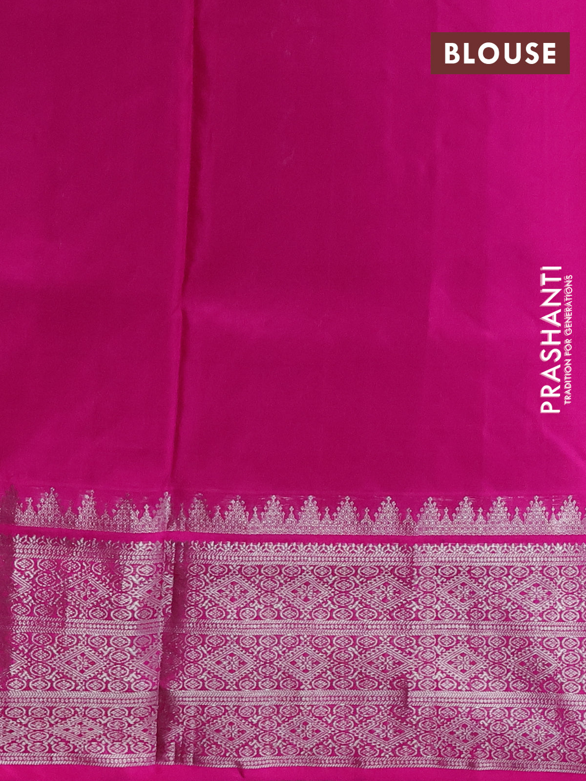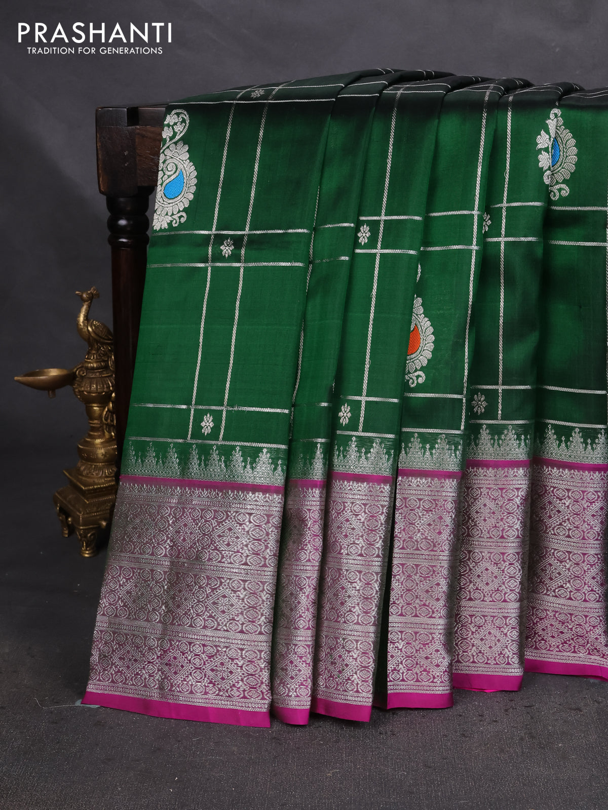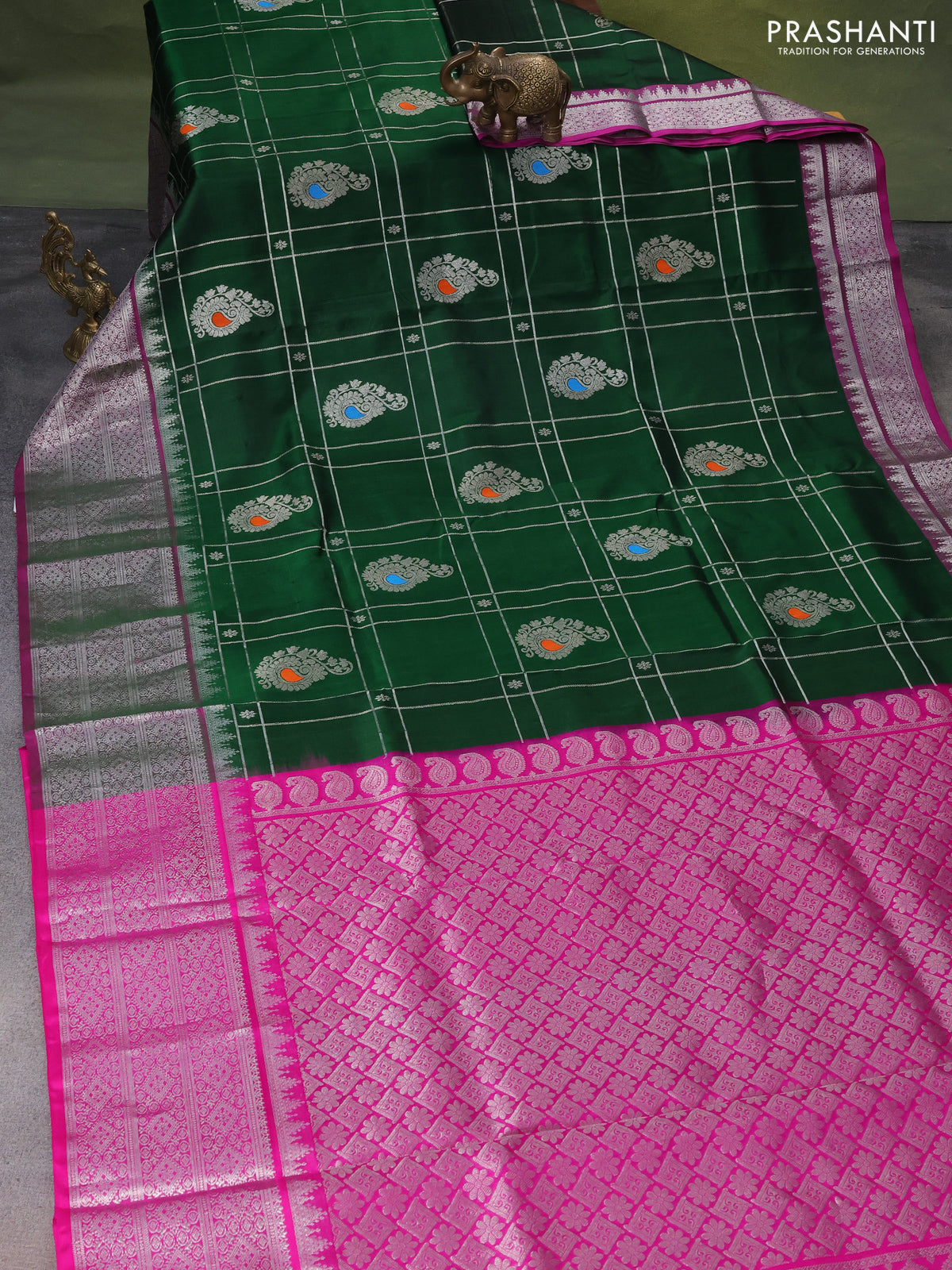 Venkatagiri silk saree green and pink with silver zari checks & buttas and long silver zari woven border