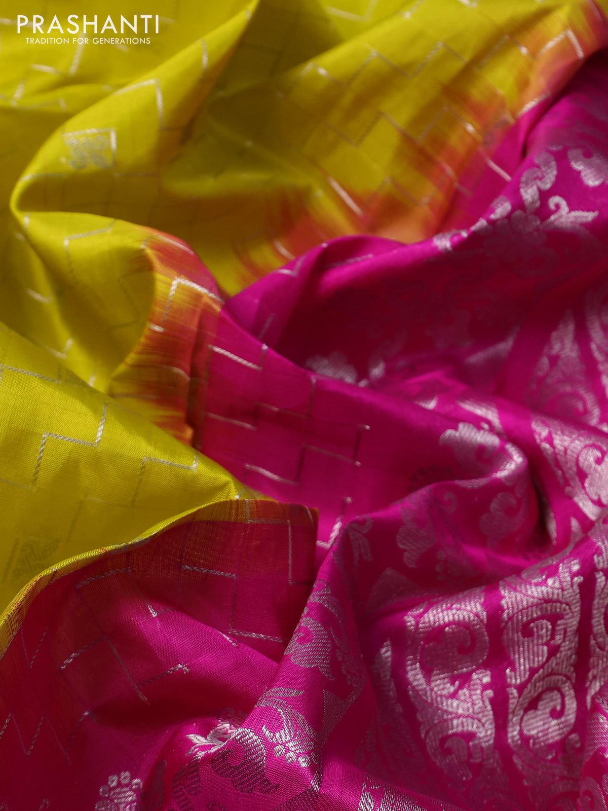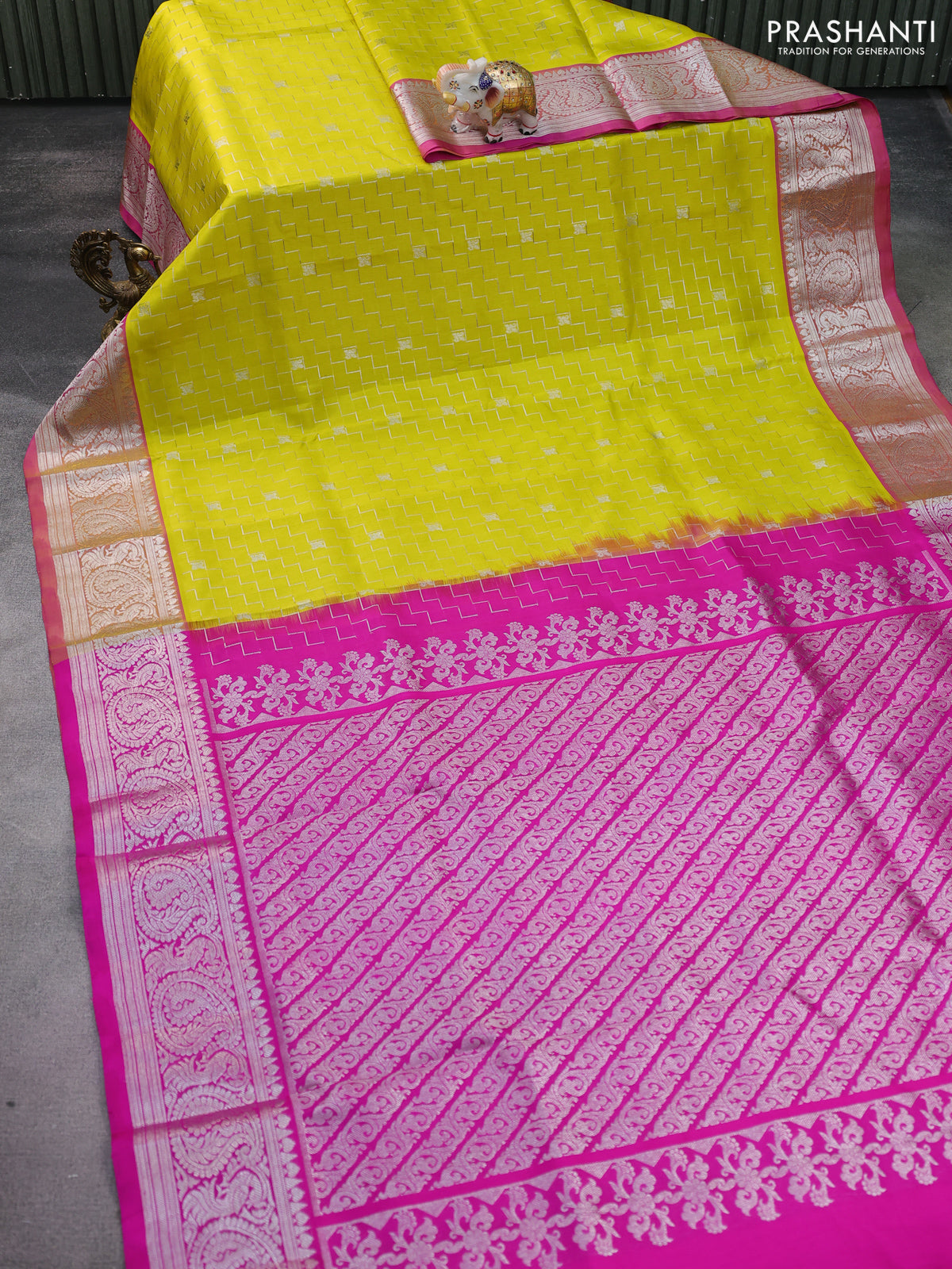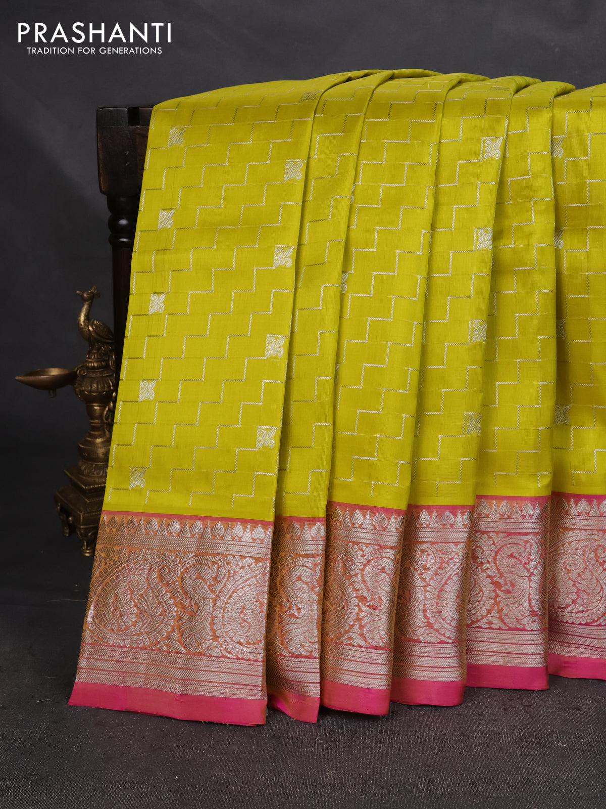 Venkatagiri silk saree lime yellow and pink with allover silver zari weaves & buttas and silver zari woven border