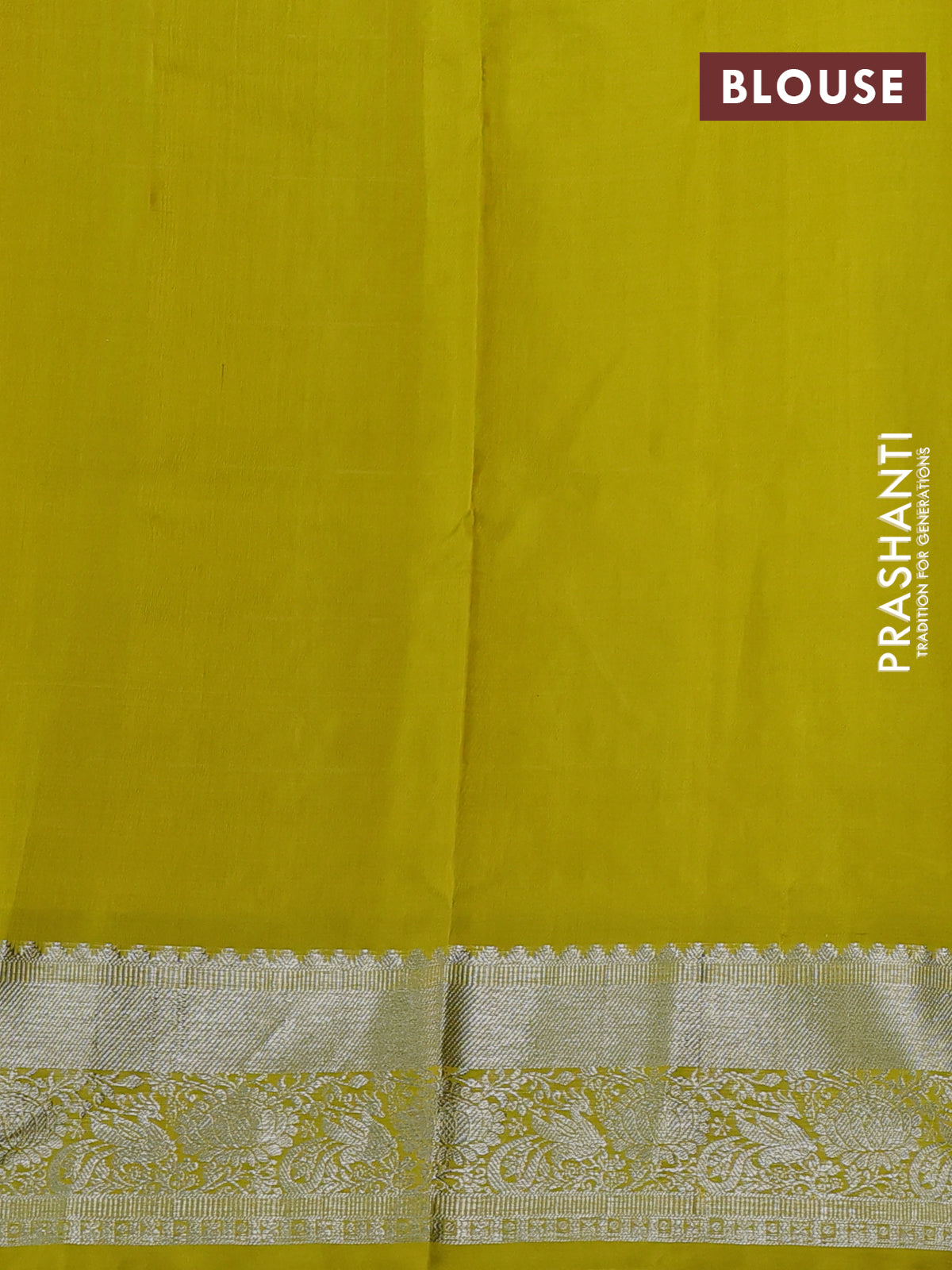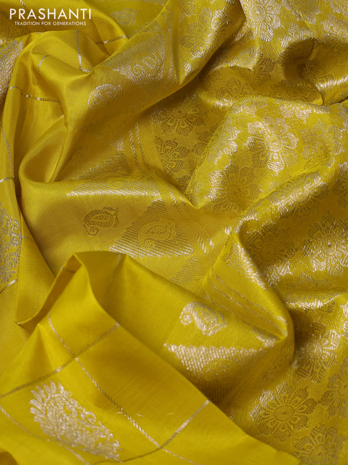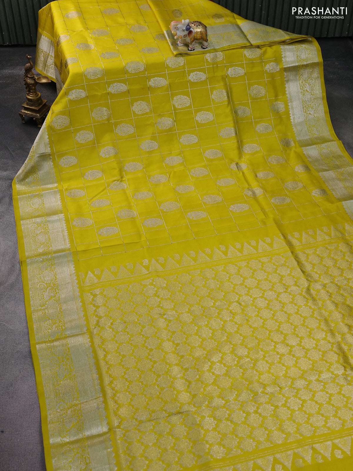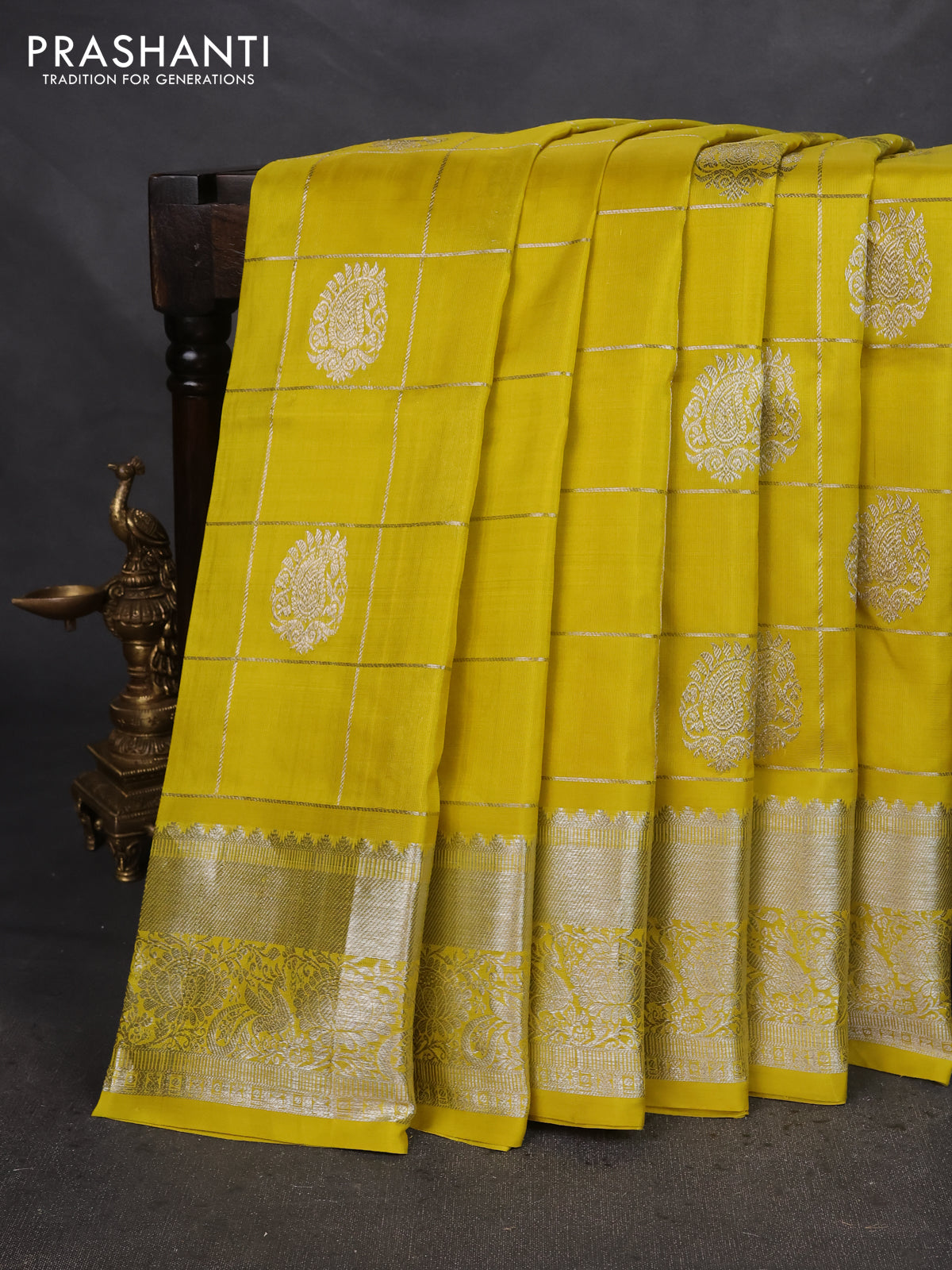 Venkatagiri silk saree lime yellow with silver zari checks & buttas and silver zari woven border
