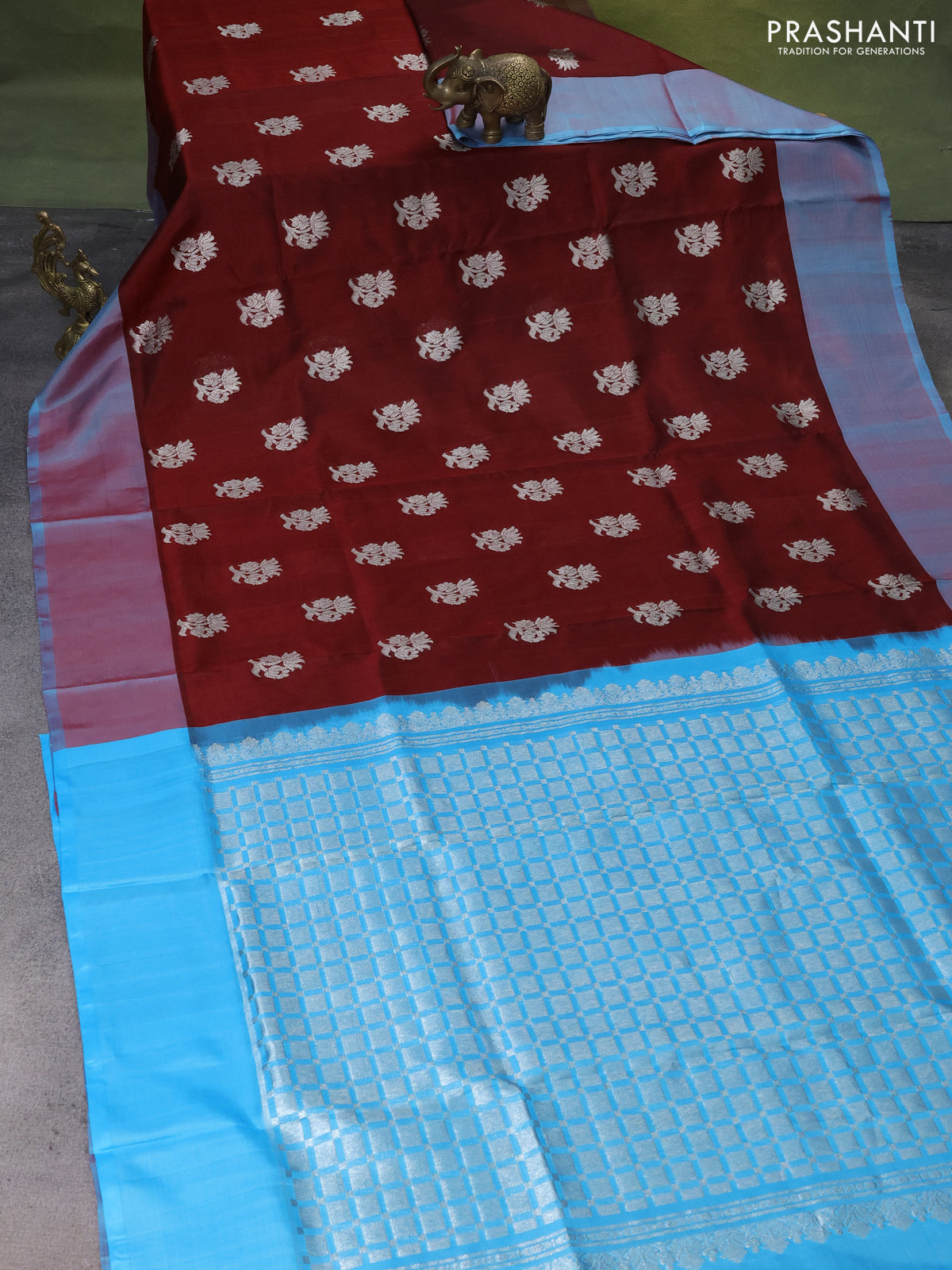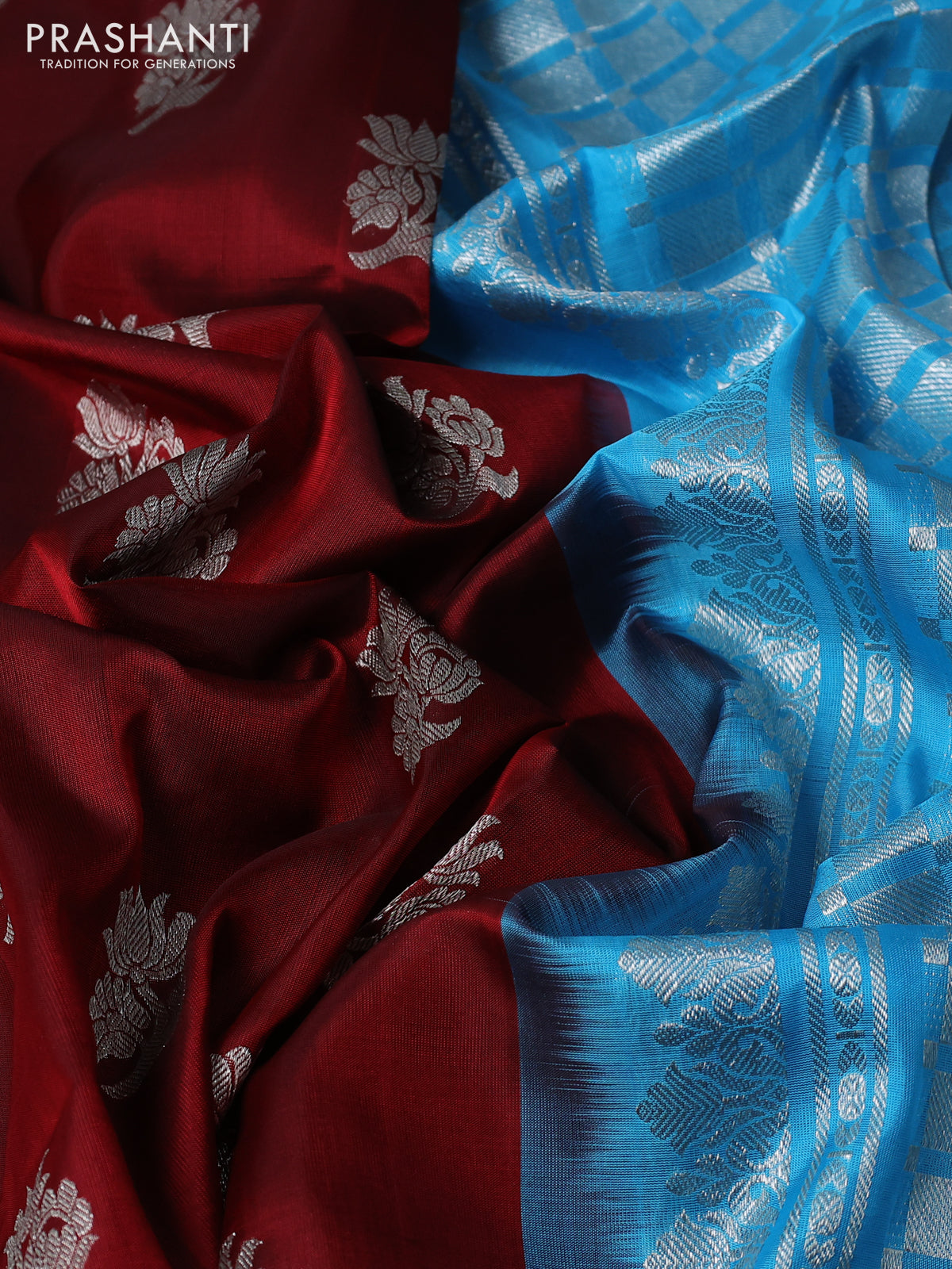 Venkatagiri silk saree maroon and light blue with silver zari woven buttas and simple border