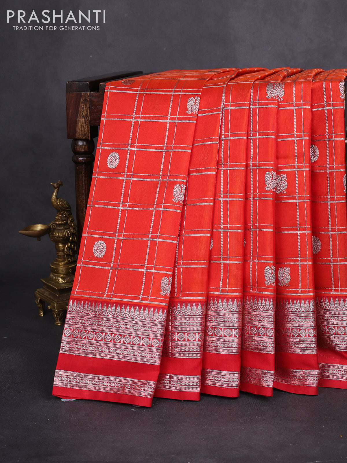 Venkatagiri silk saree orange and red with allover silver zari checks & buttas and silver zari woven border