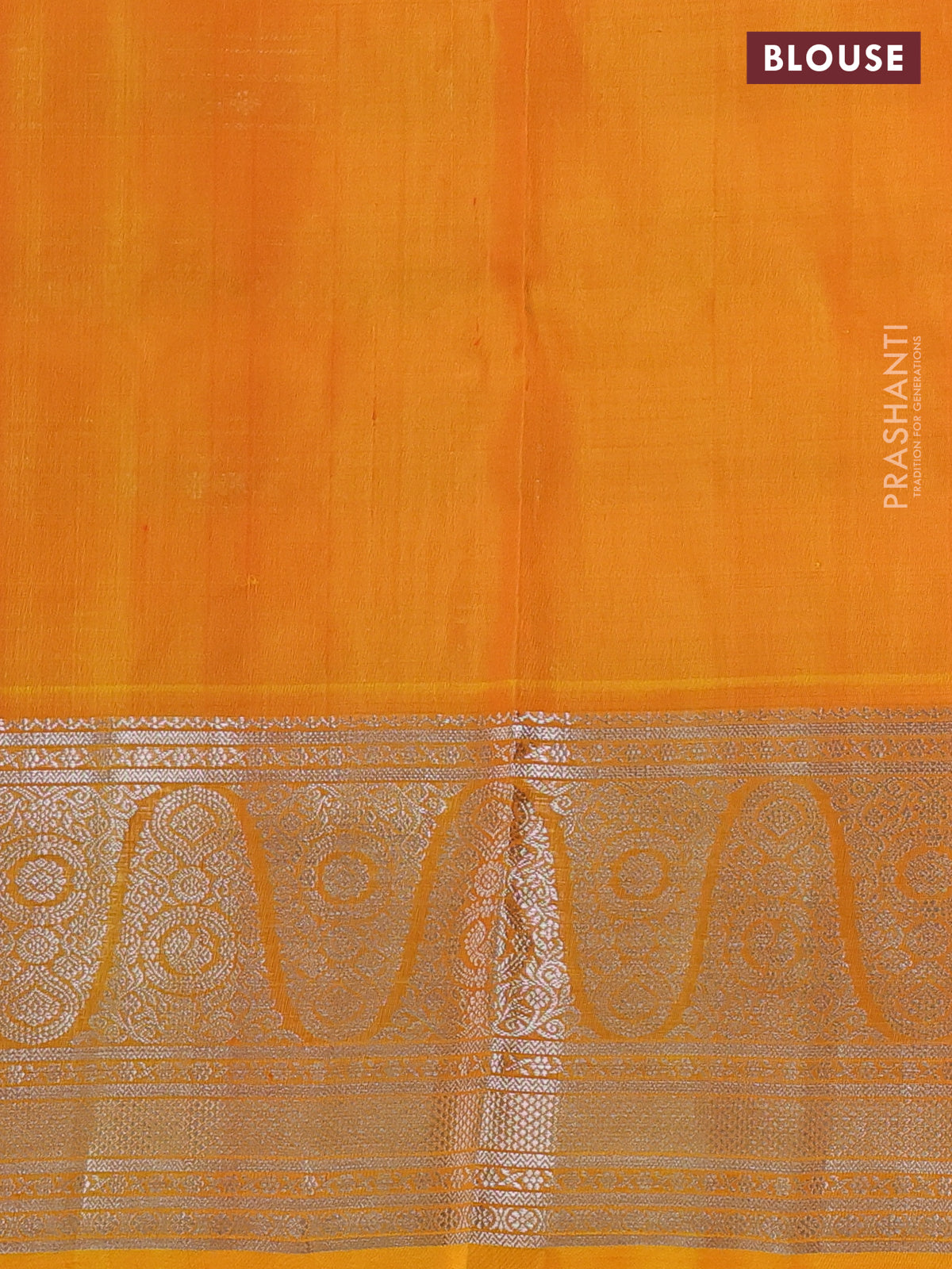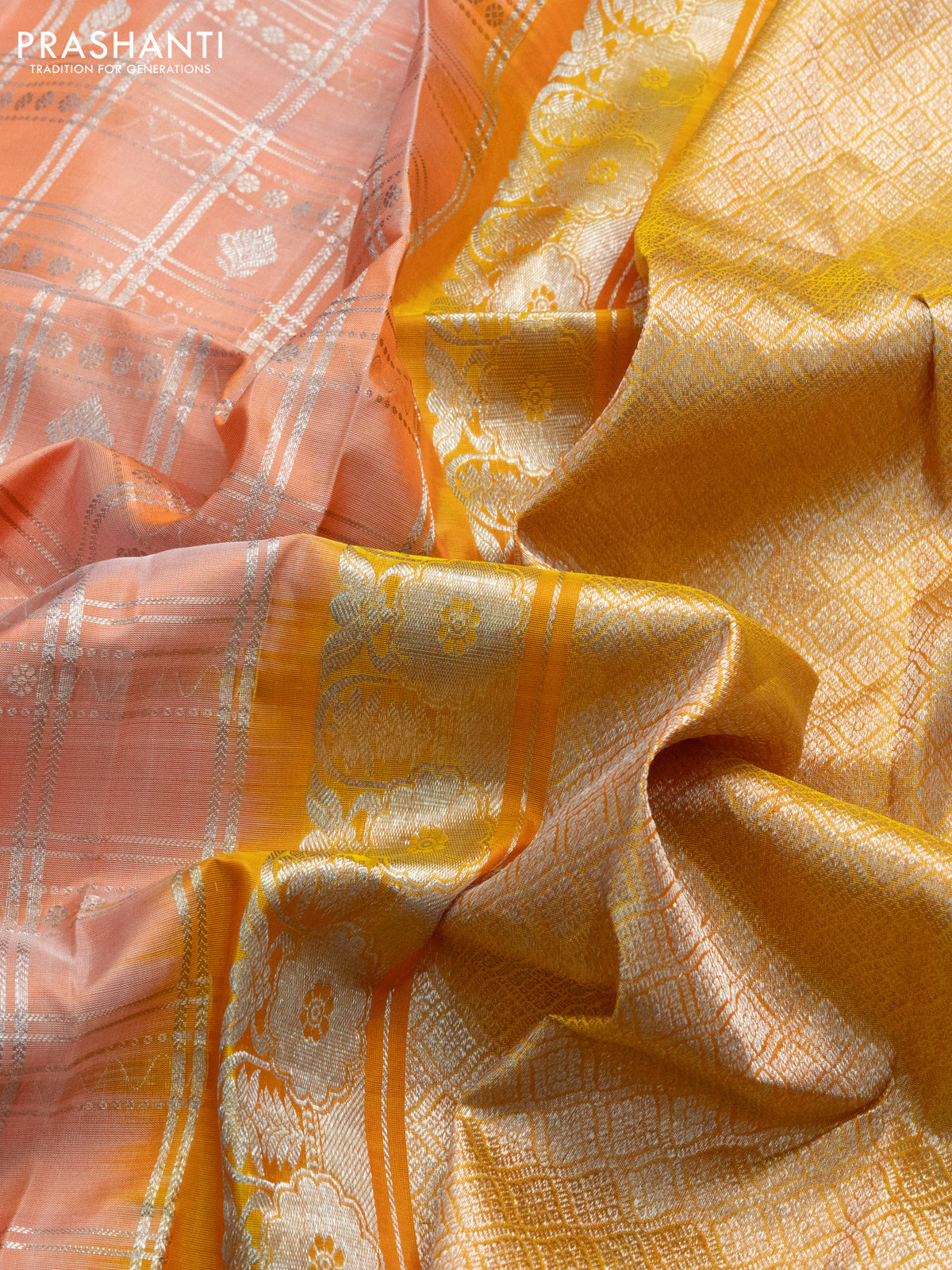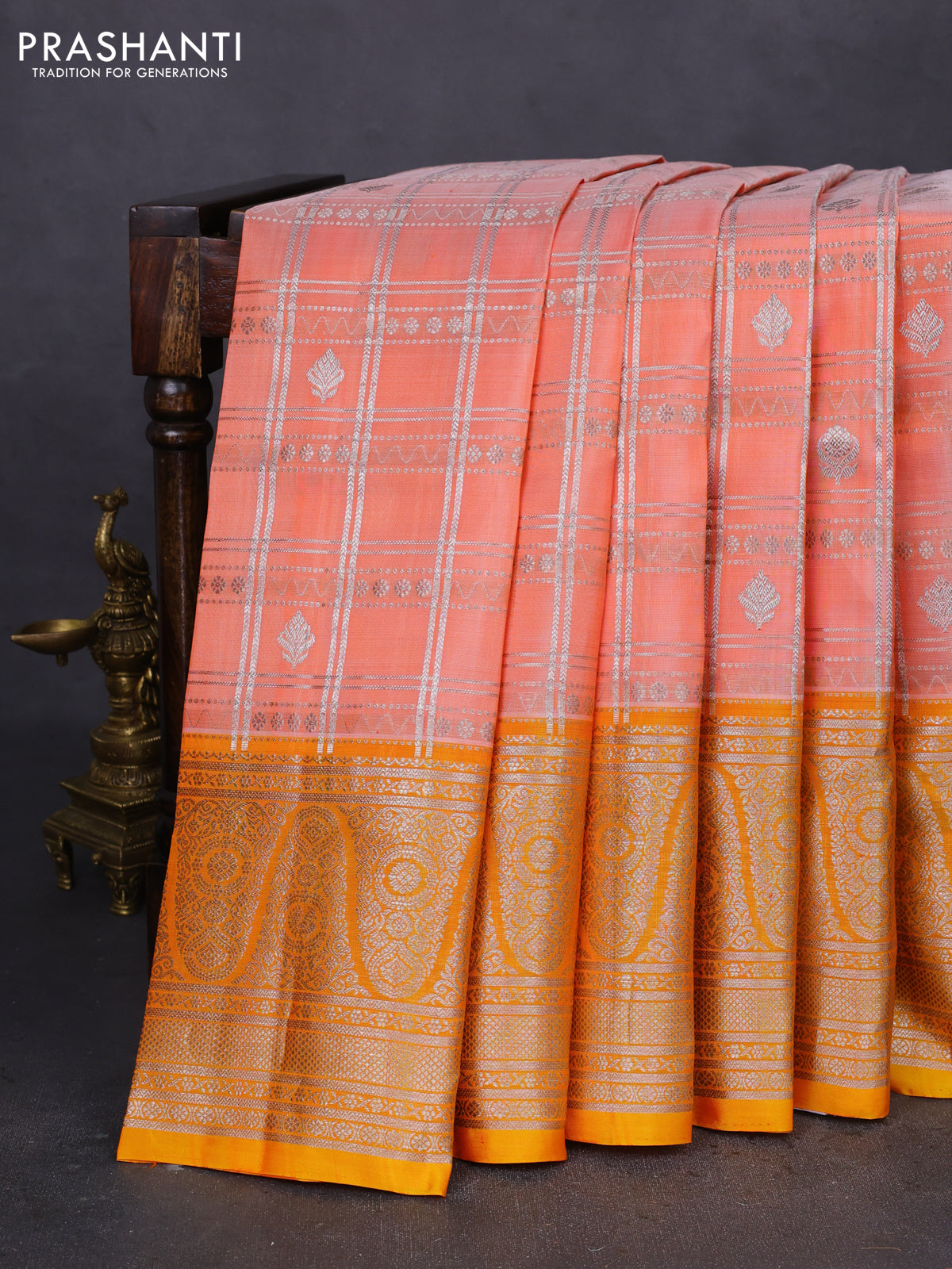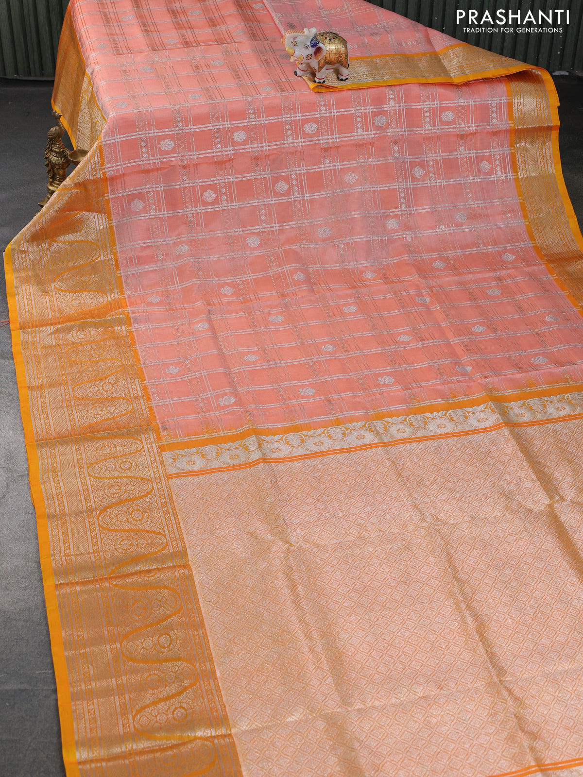 Venkatagiri silk saree orange shade and yellow with allover silver zari checks & buttas and long silver zari woven border