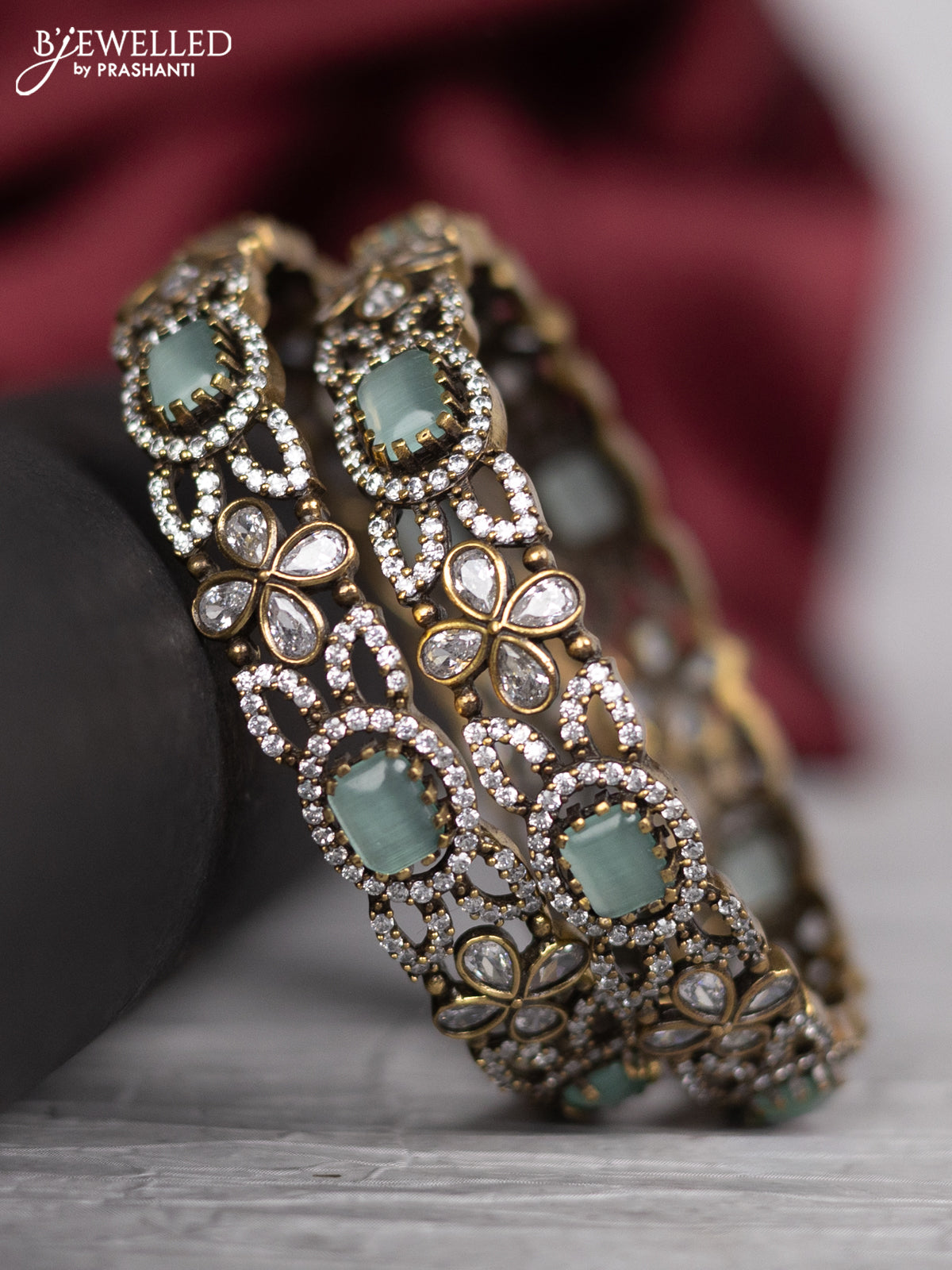 Victorian finish bangle floral design with mint green & kundan and cz stones