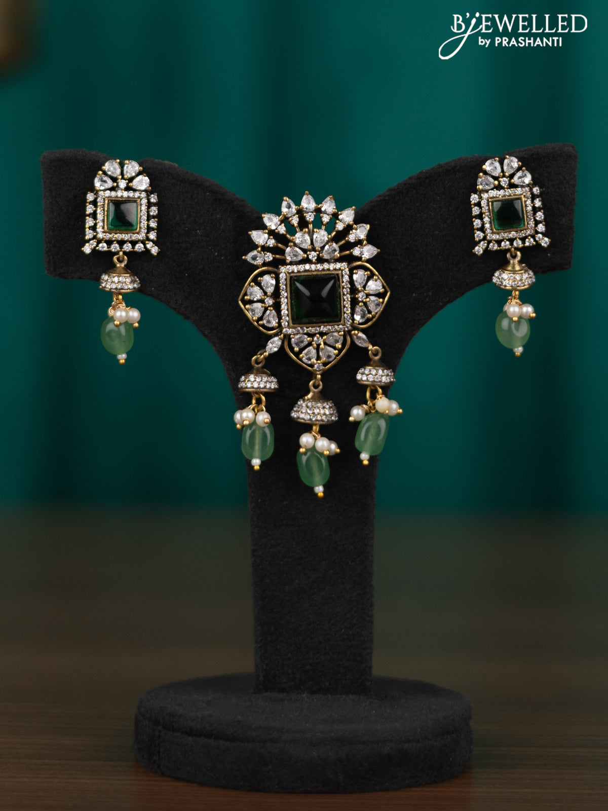 Victorian finish pendant set with emerald & cz stone and green beads hangings