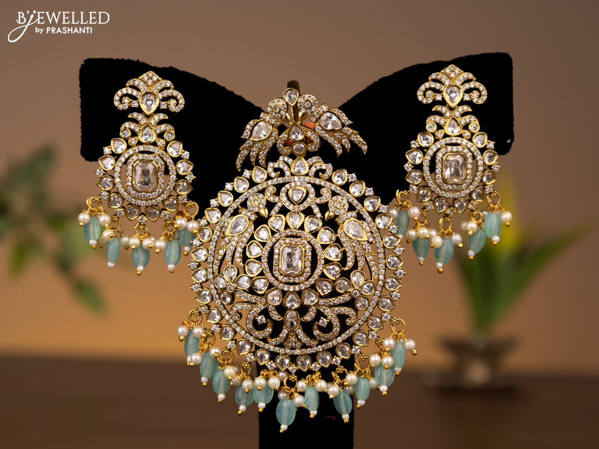 Victorian finish pendant set with kundan & cz stones and mint green beads hanging