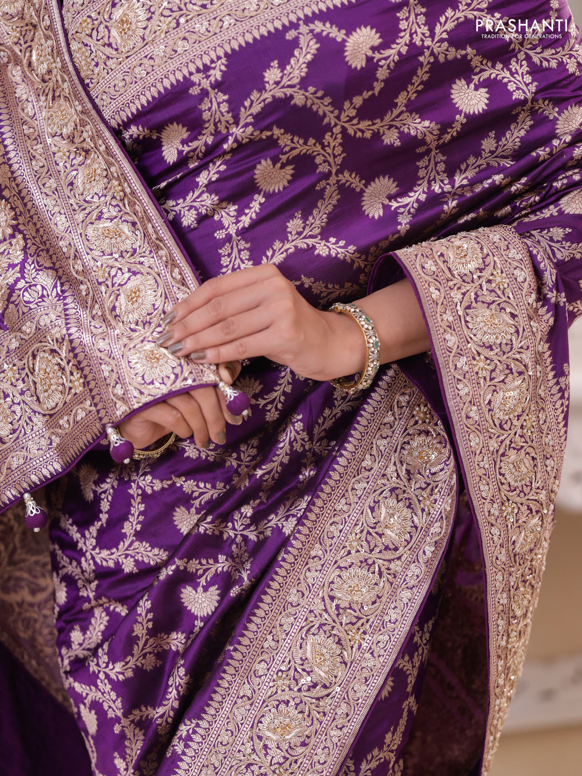Violet Banarasi Uppada silk saree with allover zari weaves & embroidery border