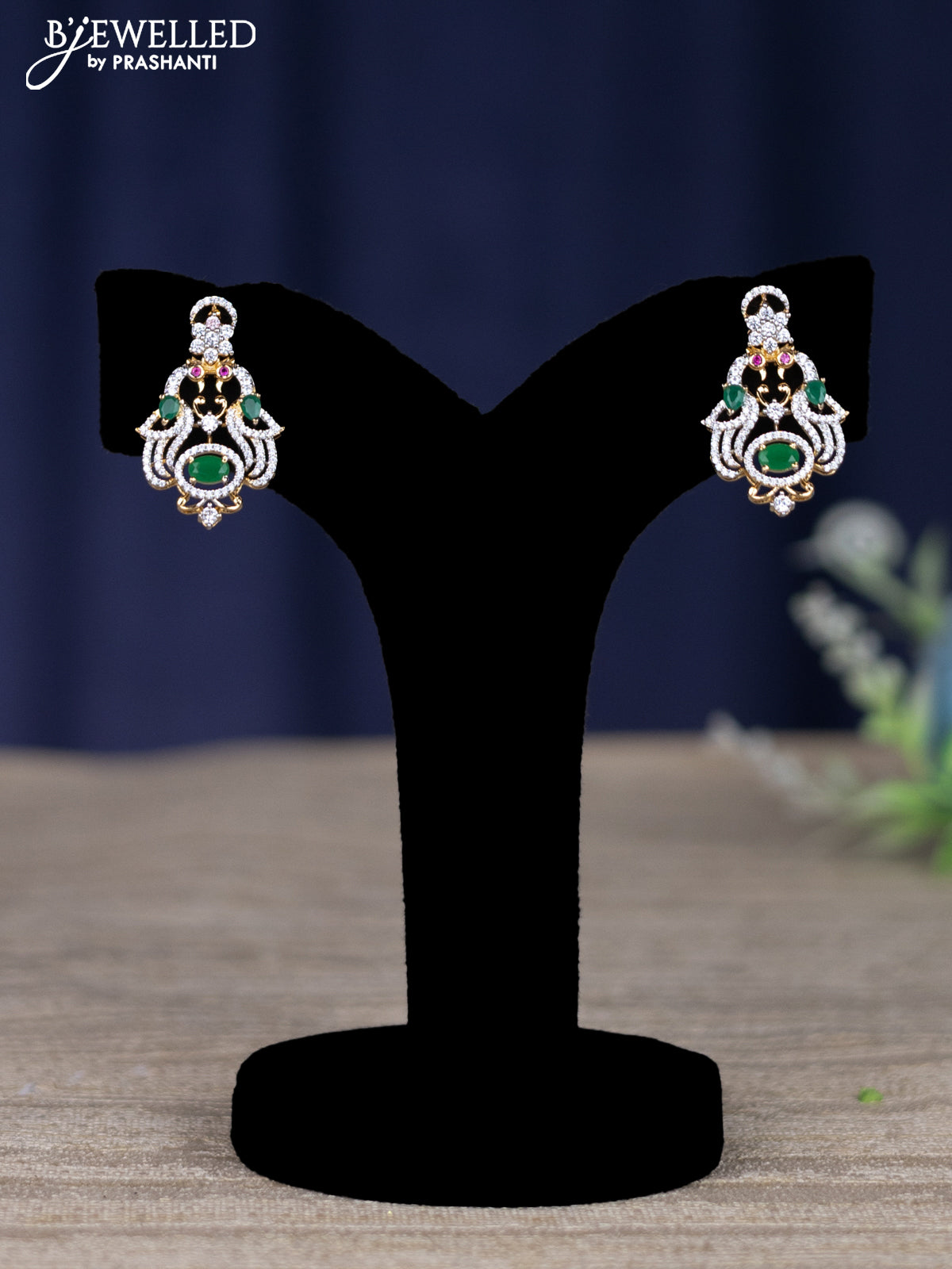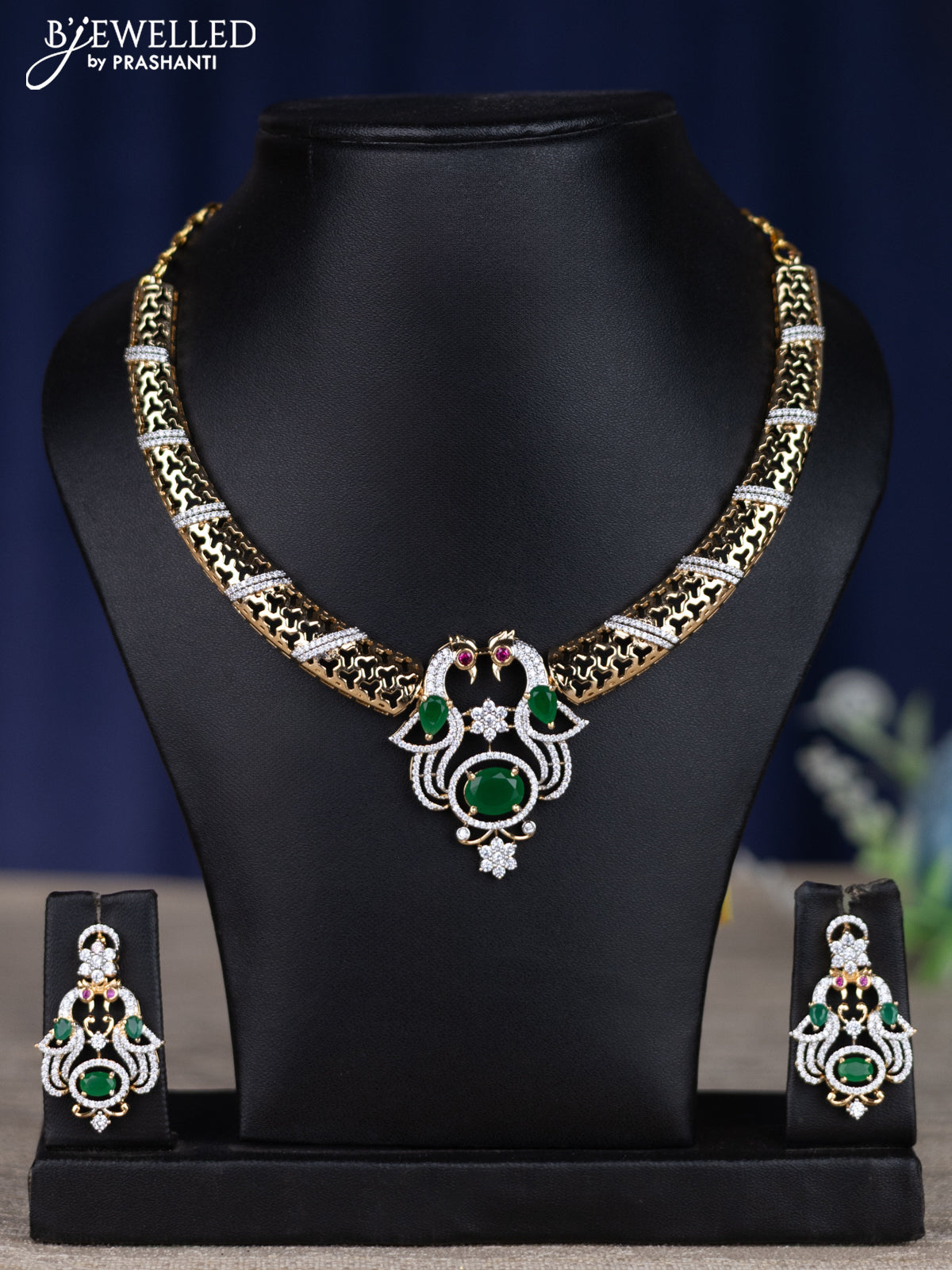 zircon necklace peacock design with emerald and cz stones in gold finish
