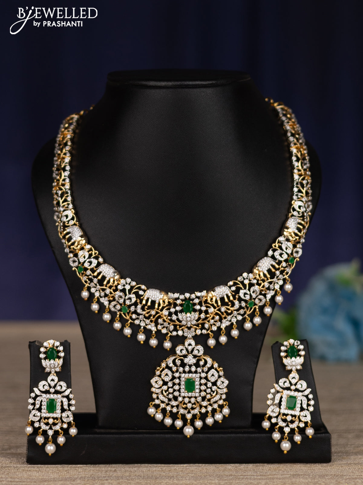 zircon necklace with emerald & cz stones and pearl hangings in gold finish