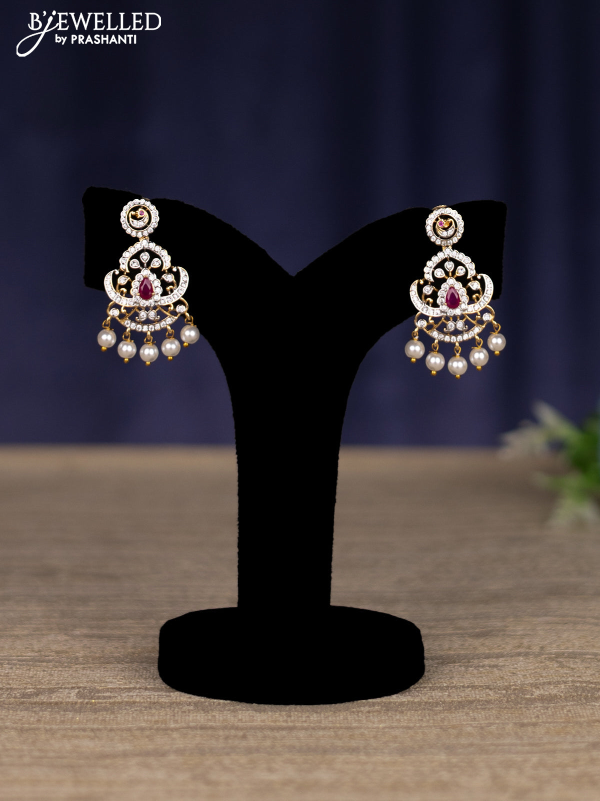 zircon necklace with ruby & cz stones and pearl hangings in gold finish