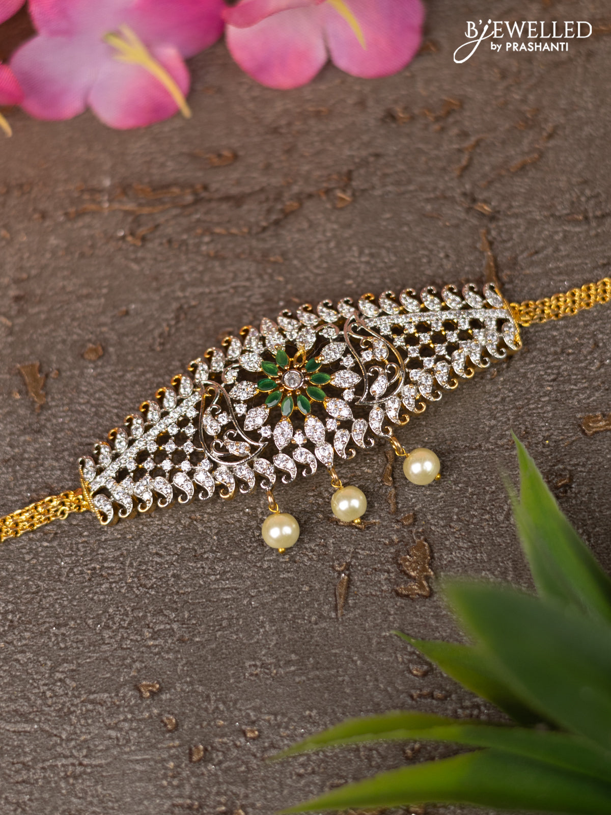 Zircon vanki with emerald & cz stones and pearl hangings in gold finish